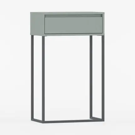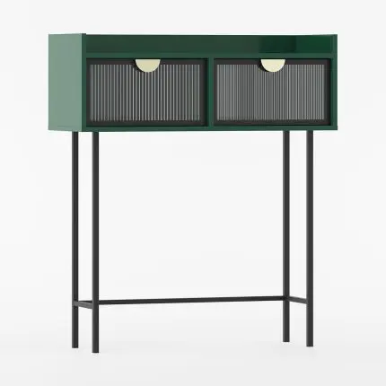 Konsollbord SIGI i støvete grønn med to skuffer, gyldne håndtak og svarte metalben.