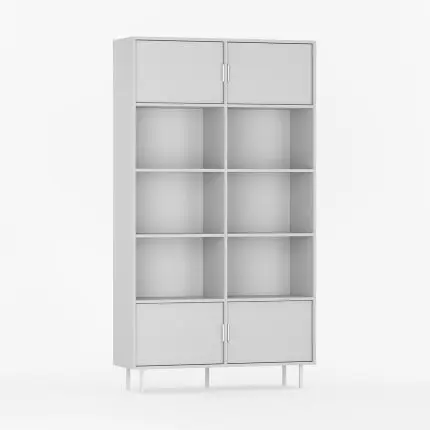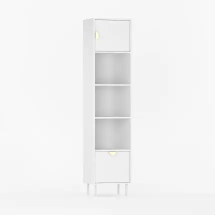 Høy og slank reol med to lukkede rom og tre åpne hyller.