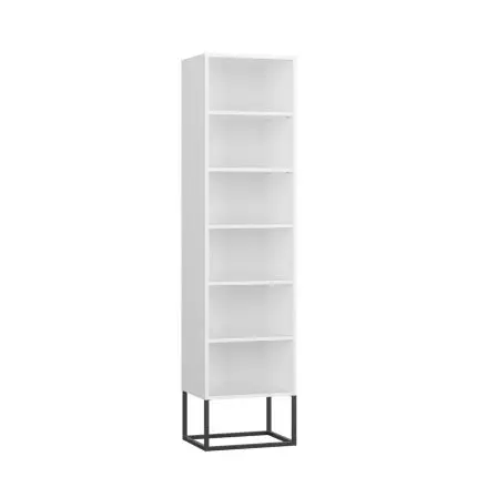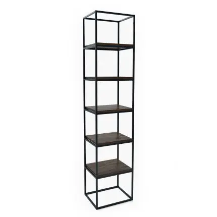 Smal og høy reol i svart metall med seks åpne hyller i trelook – modell TOWER