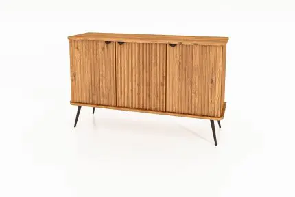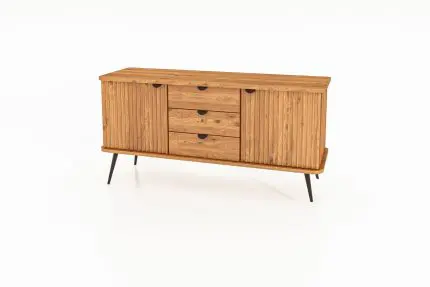 • Skjenk KULA 144 cm bred med tre skuffer og to riflede dører i oljet tre – stående på svarte metalben. Skjenk KULA 144x72 cm 22890 kr
