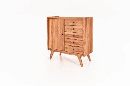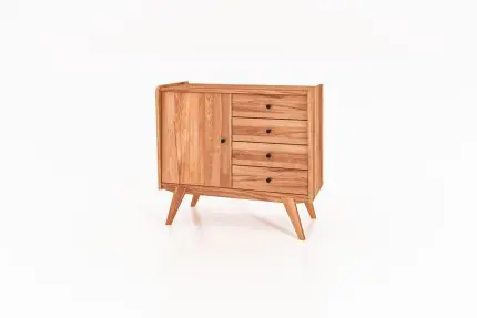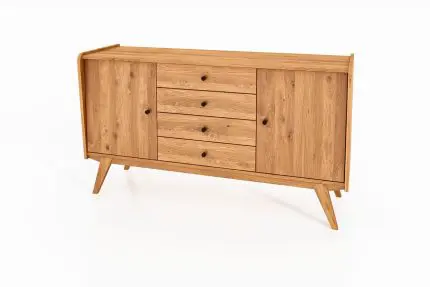 RETRO skjenk i massivt tre med én dør og fire skuffer – skråstilte ben og harmonisk design.