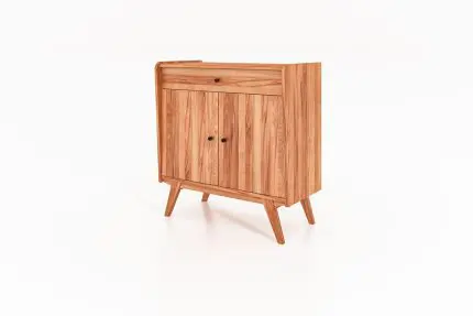 RETRO skjenk i oljet tre med to dører og én skuff – kompakt og harmonisk design med skrå ben.