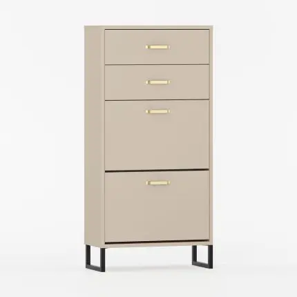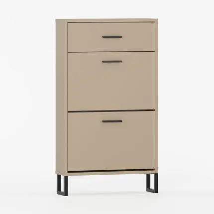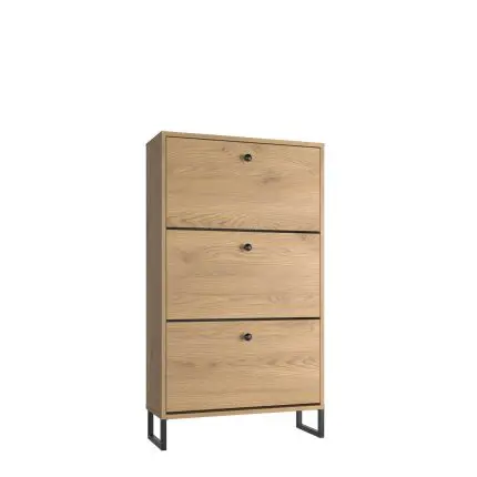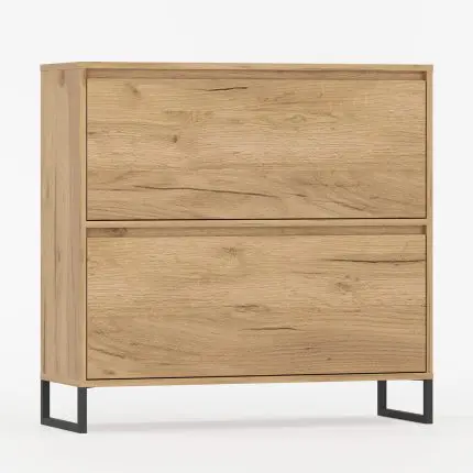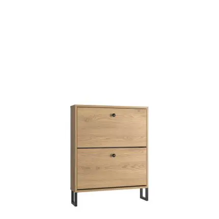 Skoskap SIGI i trelook med to dører og svarte håndtak på svarte ben.