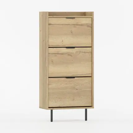 Smalt og høyt skoskap med sorte ben og håndtak.