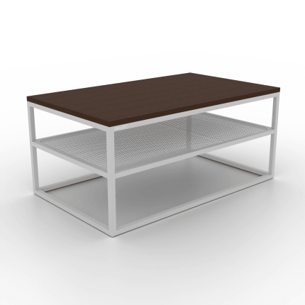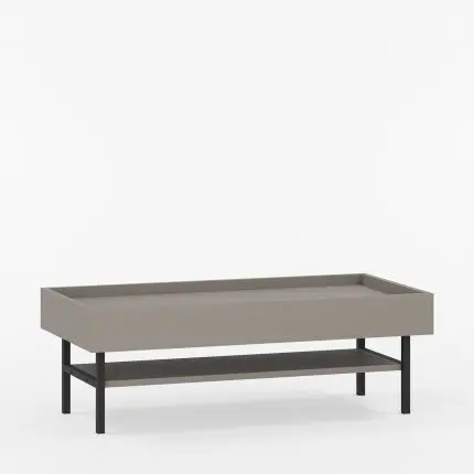 Rektangulært sofabord med svart stativ, bordplate i trelook og lav metallhylle – funksjonelt og stilrent design.