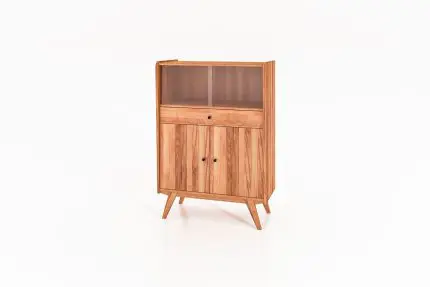 RETRO vitrineskap i massivt tre med glass øverst, en praktisk skuff og to tredører nederst.