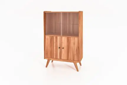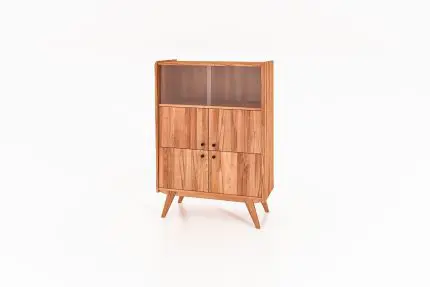 RETRO vitrineskap i massivt tre med glass øverst og fire dører nederst. Designet står på skrå ben og har et varmt, skandinavisk uttrykk.