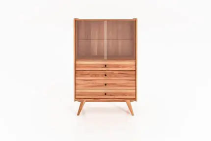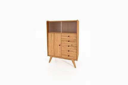 RETRO vitrineskap i massivt tre med glasshylle, fem skuffer og én dør. Designet står på skrå ben og kombinerer funksjon og estetikk.