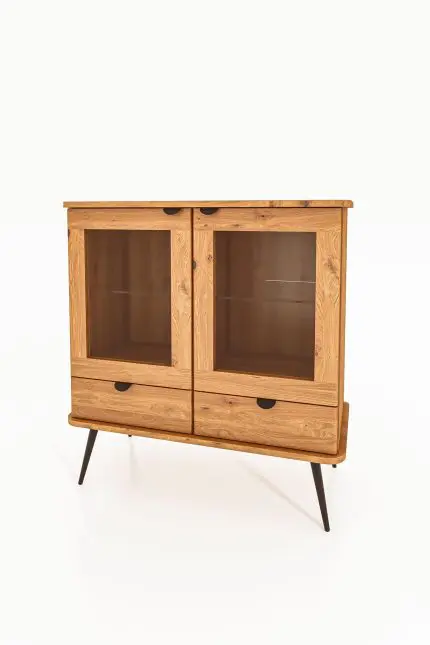 Vitrineskap KULA i oljet eik med to glassdører og to skuffer, stående på slanke svarte ben – ideelt for stue eller spisestue.