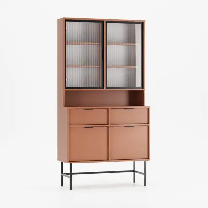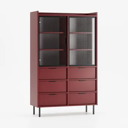 Vitrineskap SIGI med glassdører og seks skuffer i kasjmirfarge.