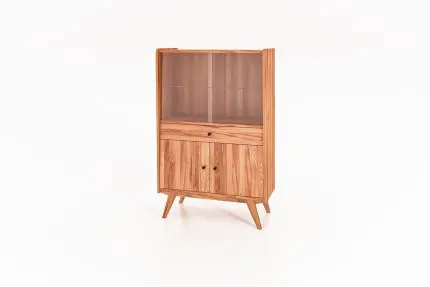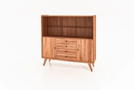 Stort RETRO vitrineskap i oljet tre med åpent øvre rom, fire skuffer i midten og to dører på sidene. Designet av Windes | Lines.