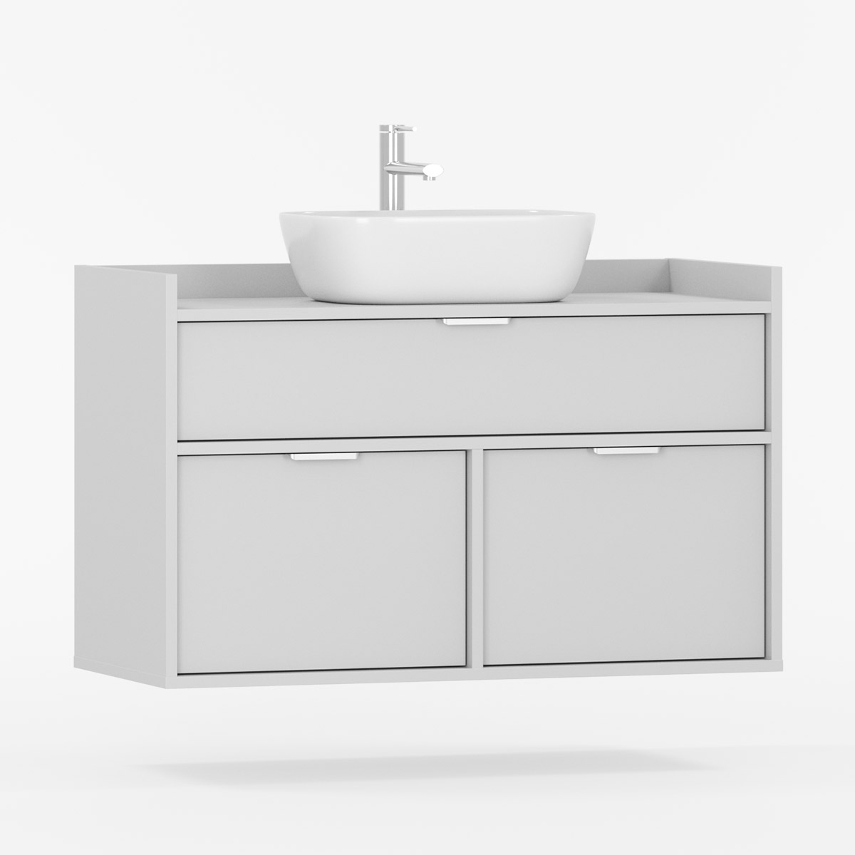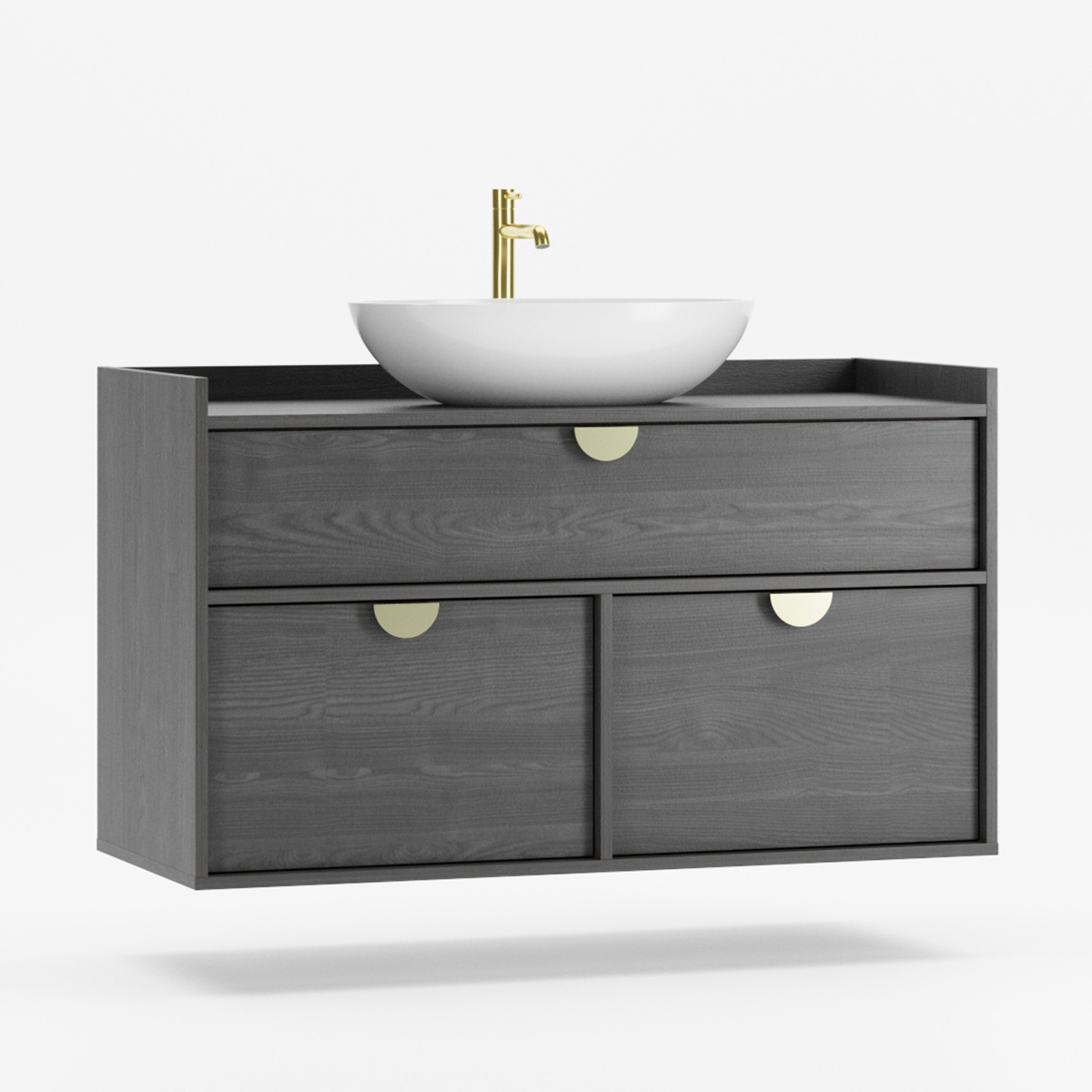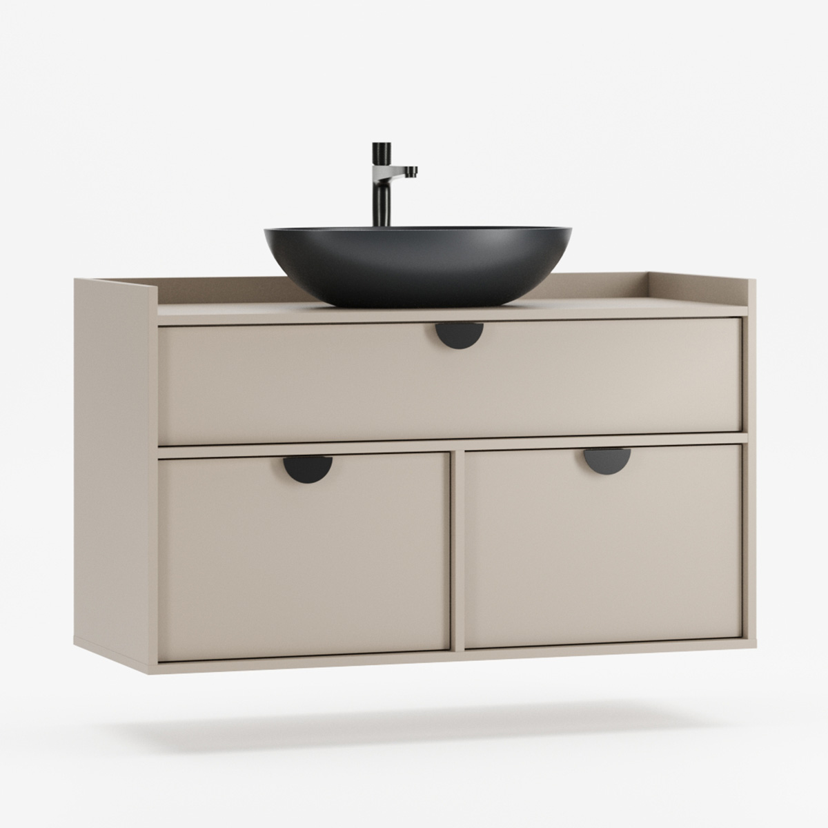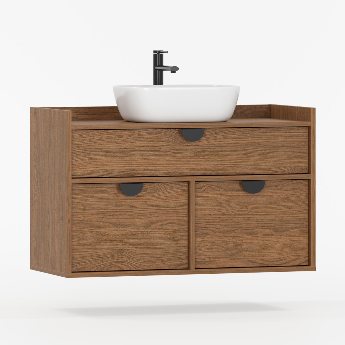 SIGI WSU01 er en veggmontert komplett løsning som forener funksjon og estetikk i moderne baderom. Tre praktiske skuffer gir rikelig oppbevaring – den øverste tilpasset rørføring, de to nederste perfekte til kosmetikk og tilbehør.