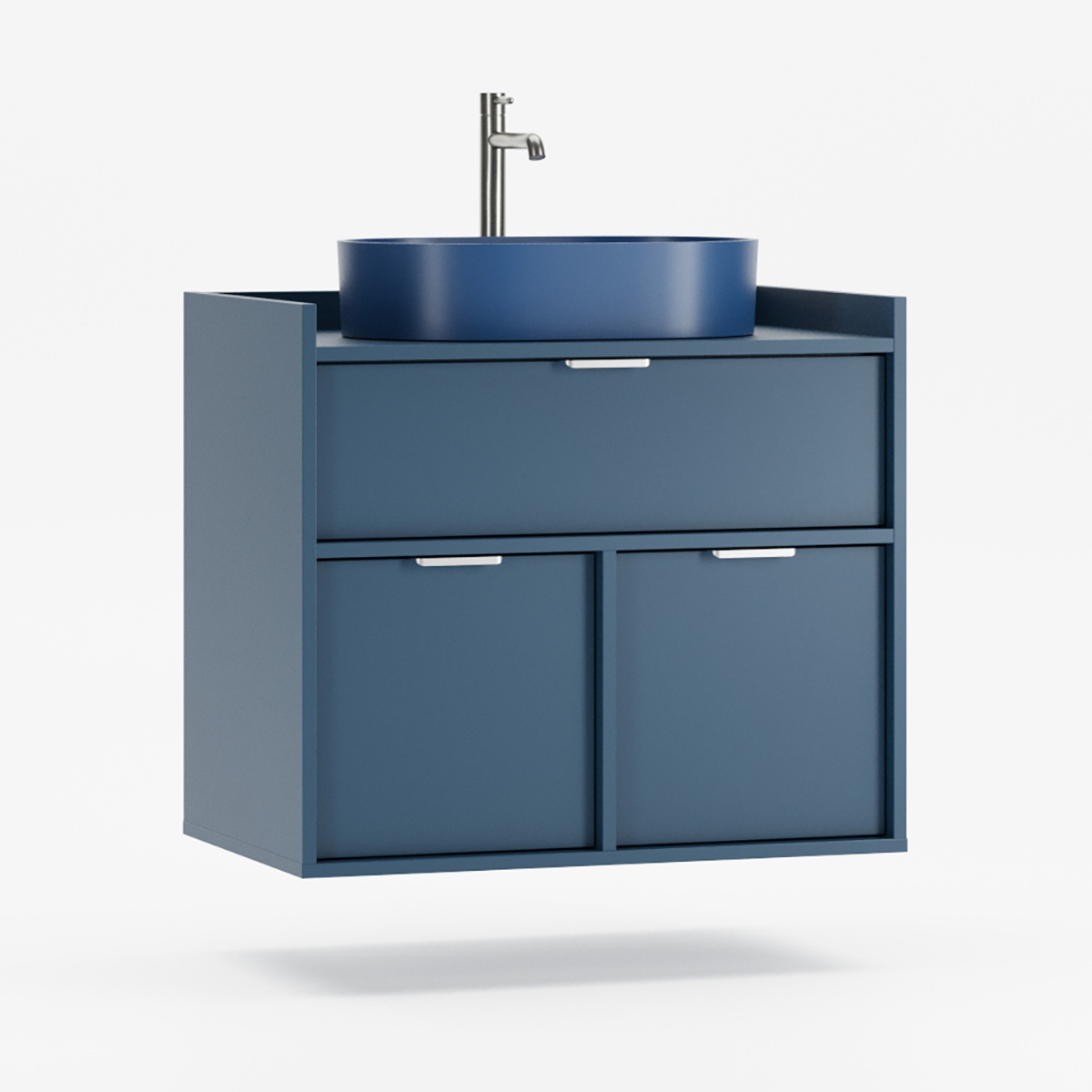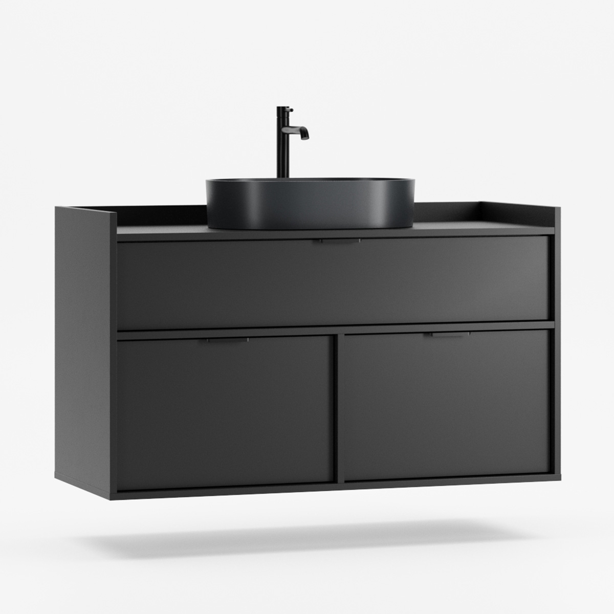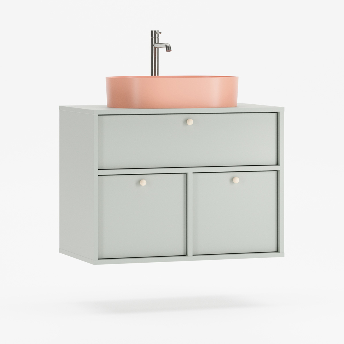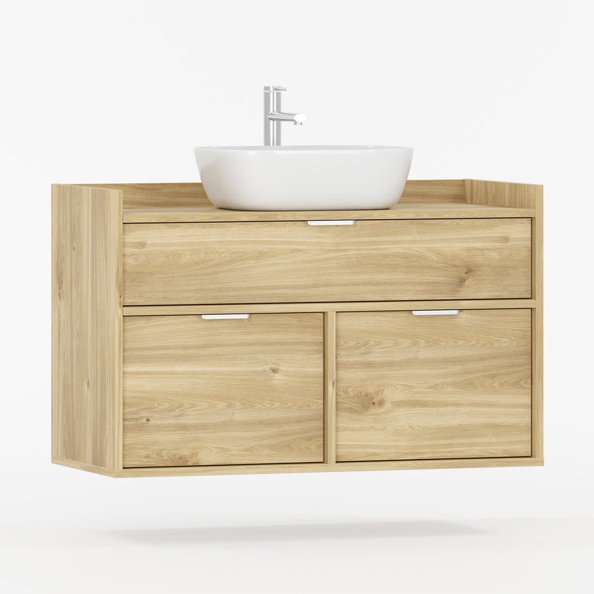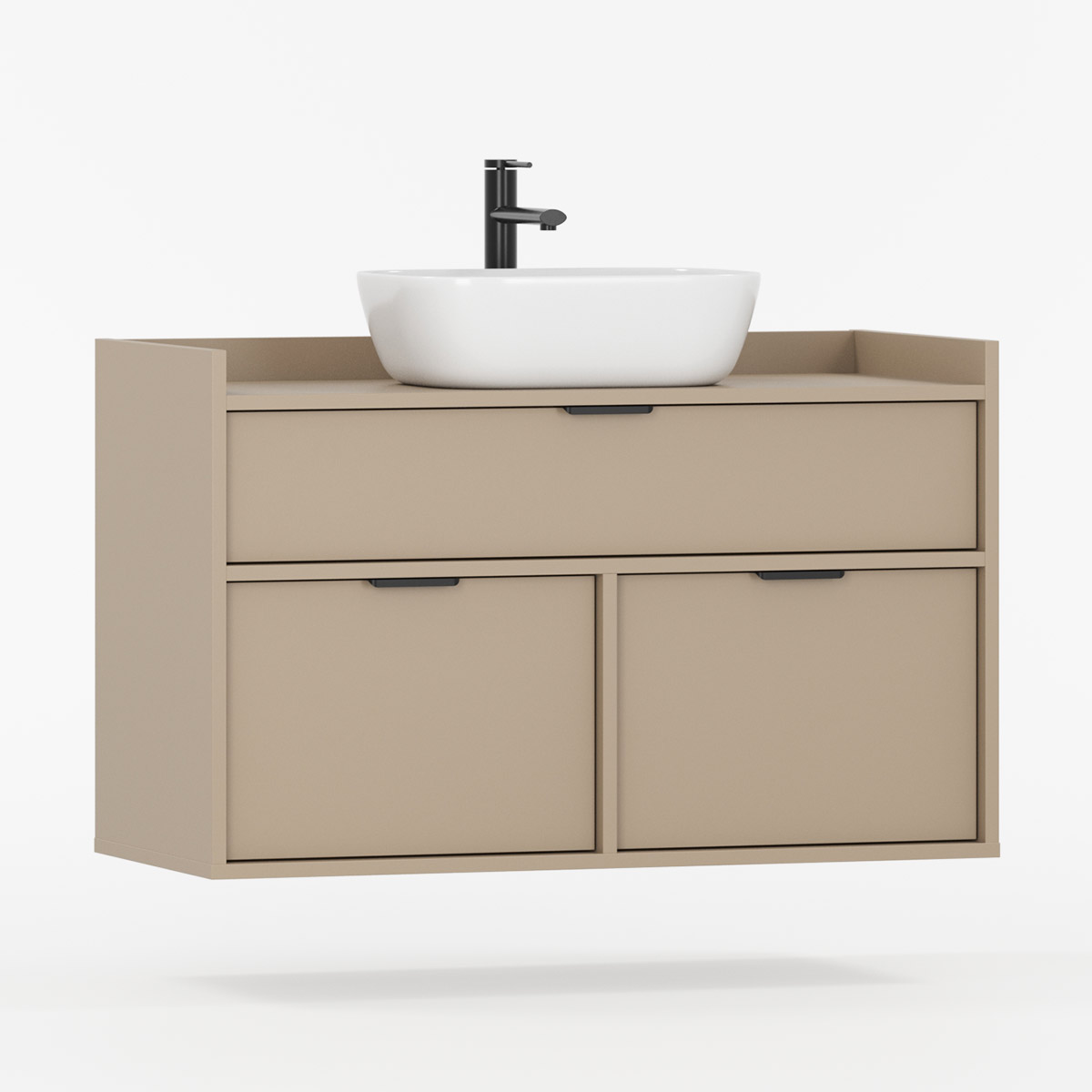 SIGI WSU01 er en veggmontert komplett løsning som forener funksjon og estetikk i moderne baderom. Tre praktiske skuffer gir rikelig oppbevaring – den øverste tilpasset rørføring, de to nederste perfekte til kosmetikk og tilbehør.
