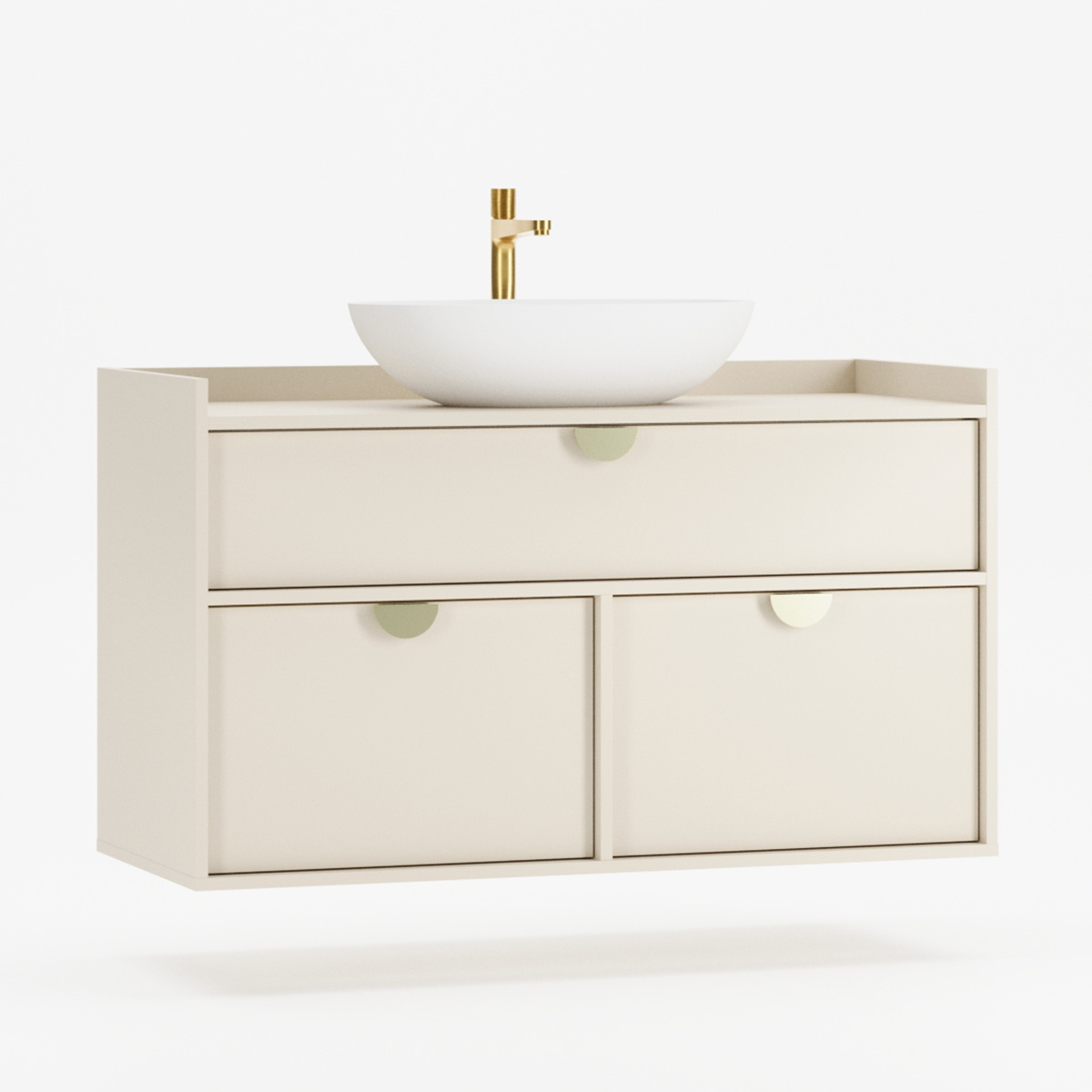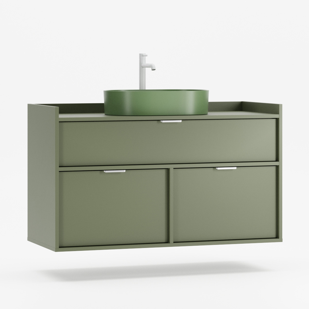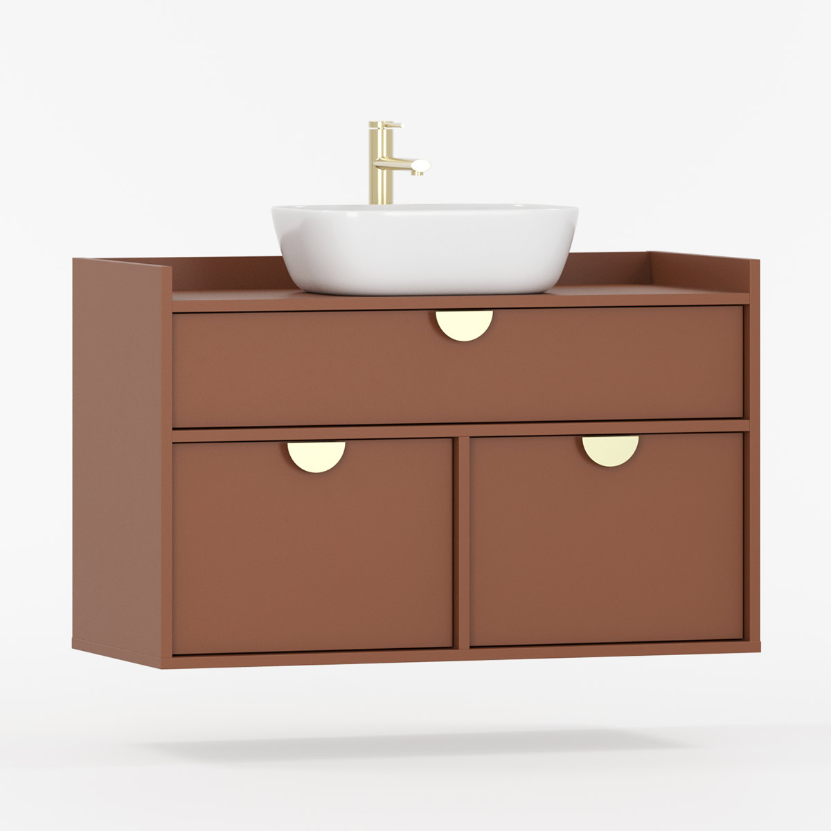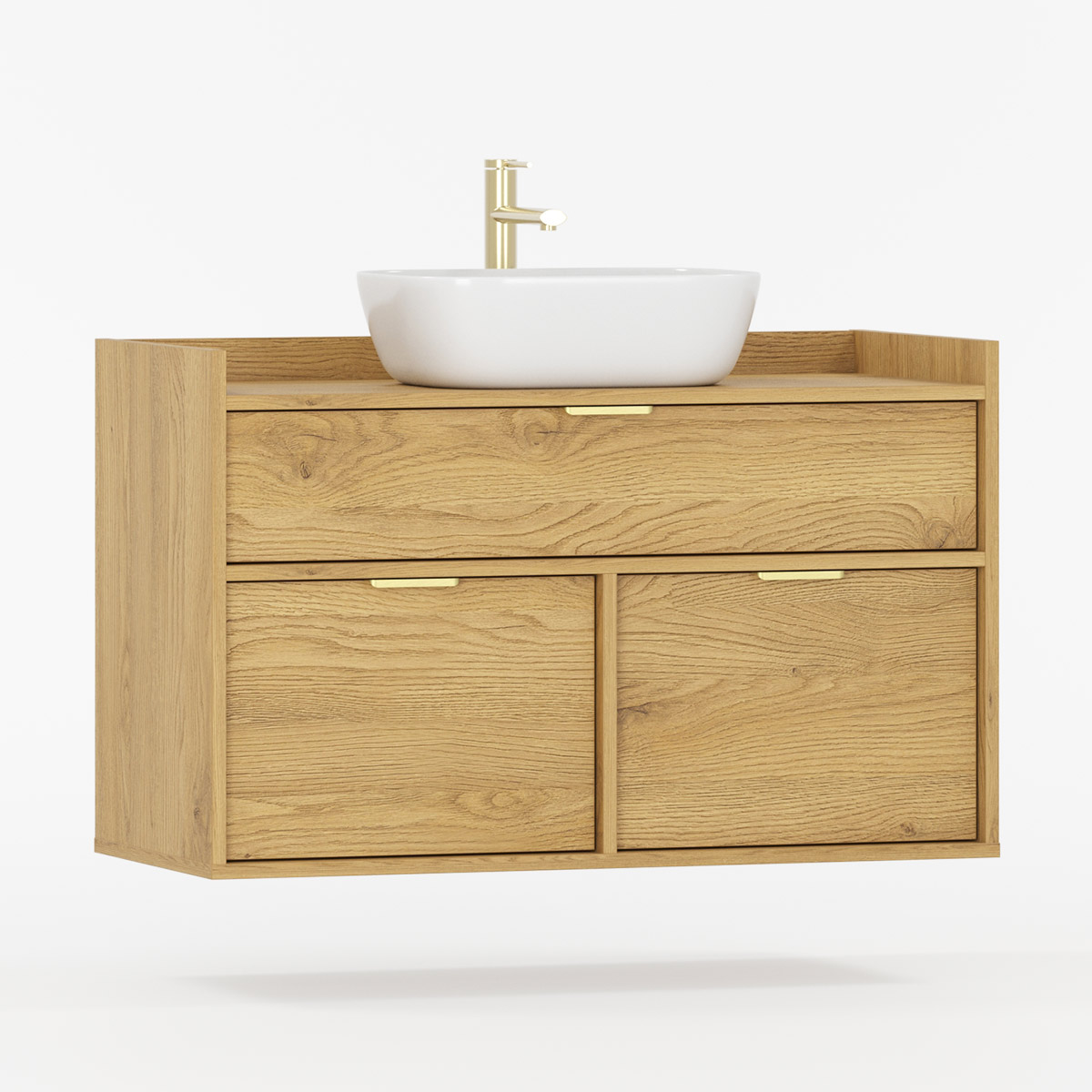 SIGI WSU01 er en veggmontert komplett løsning som forener funksjon og estetikk i moderne baderom. Tre praktiske skuffer gir rikelig oppbevaring – den øverste tilpasset rørføring, de to nederste perfekte til kosmetikk og tilbehør.