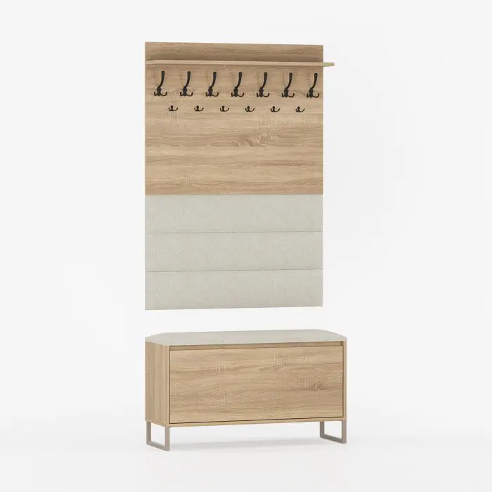 Skoskapet har polstret sete og romslig oppbevaring med hylle, mens knaggrekken med øvre hylle gir god plass til yttertøy og tilbehør. De polstrede panelene gir en lun atmosfære og gjør helheten komplett.
