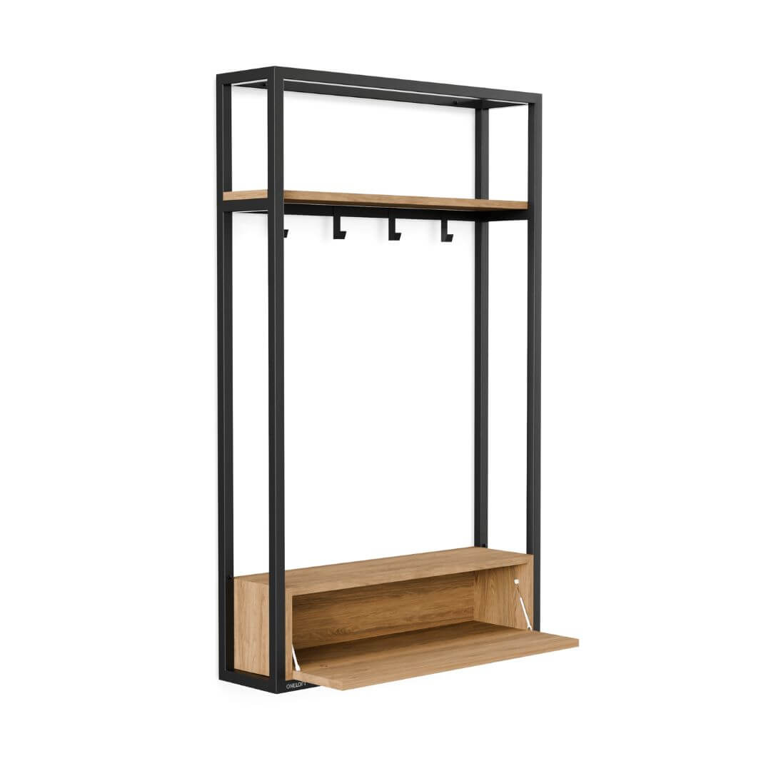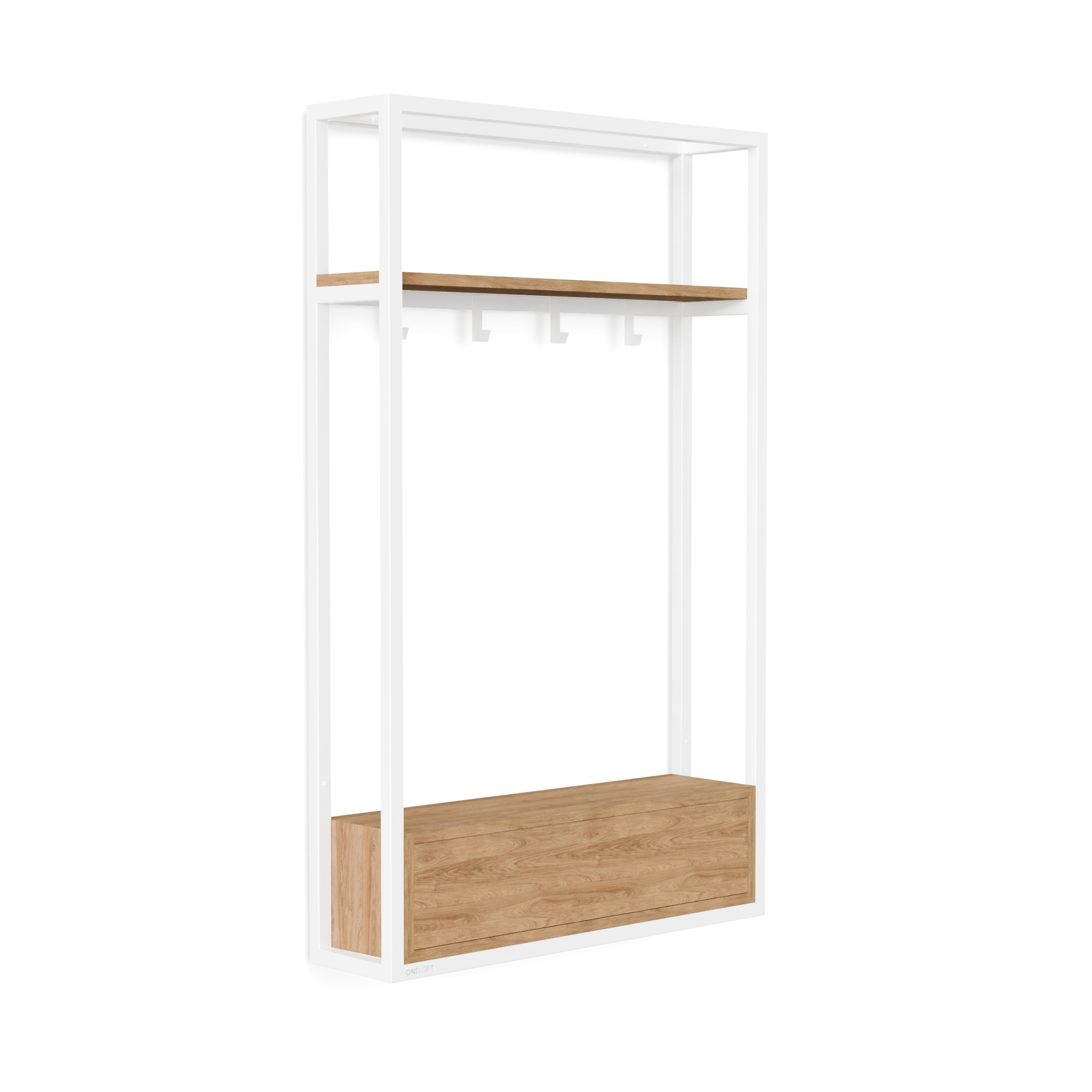 CANTTAR forener lukket oppbevaring med åpne løsninger i ett gjennomtenkt design. Det romslige skapet nederst skjuler sko og vesker, mens hattehyllen og fire sorte metallkroker holder daglige plagg lett tilgjengelig.