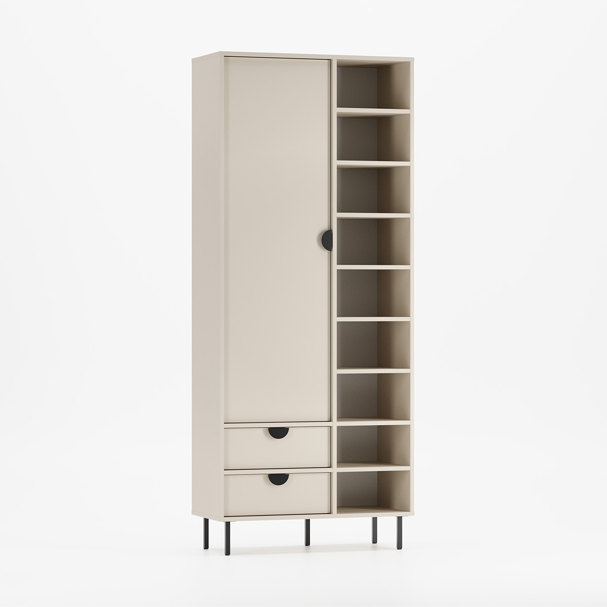 SIGI SZSA7 fanger blikket med sin asymmetriske form som balanserer visuell letthet med praktisk funksjonalitet. Den garderobedelen med garderobehenger og to skuffer kombineres med åpen hylleseksjon for bøker og personlige gjenstander.