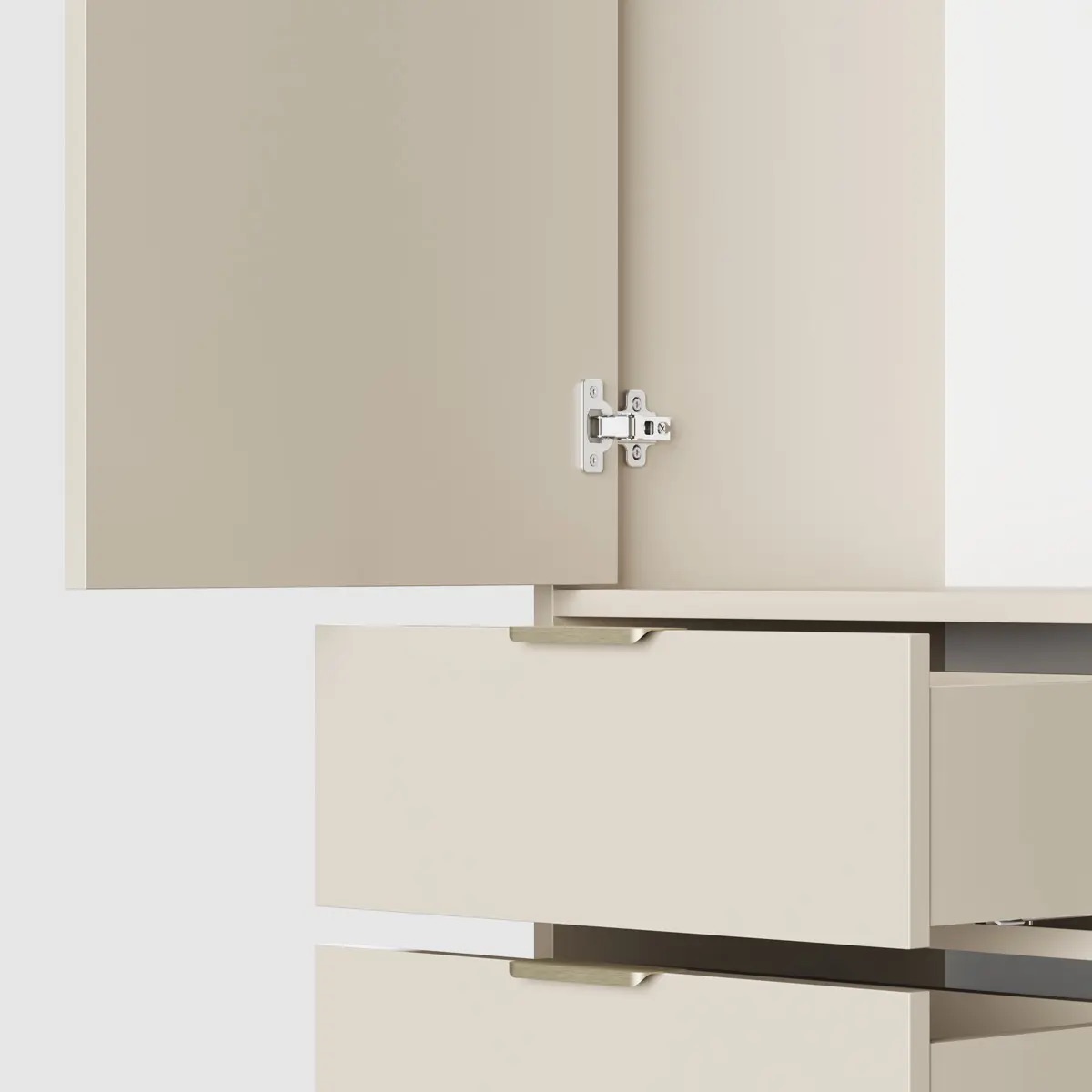 De tilbaketrukne frontene og elegante stålbenene skaper visuell dybde, mens designet kan tilpasses fullstendig i bredde, dybde og farger. Som del av SIGI-kolleksjonen kan det enkelt kombineres med andre moduler for å skape sammenheng i rommet.