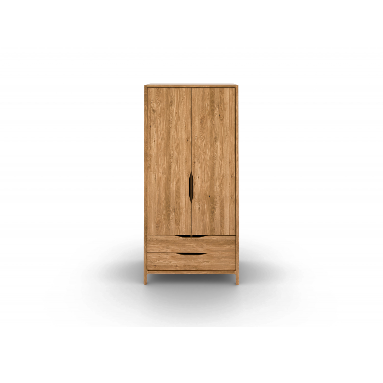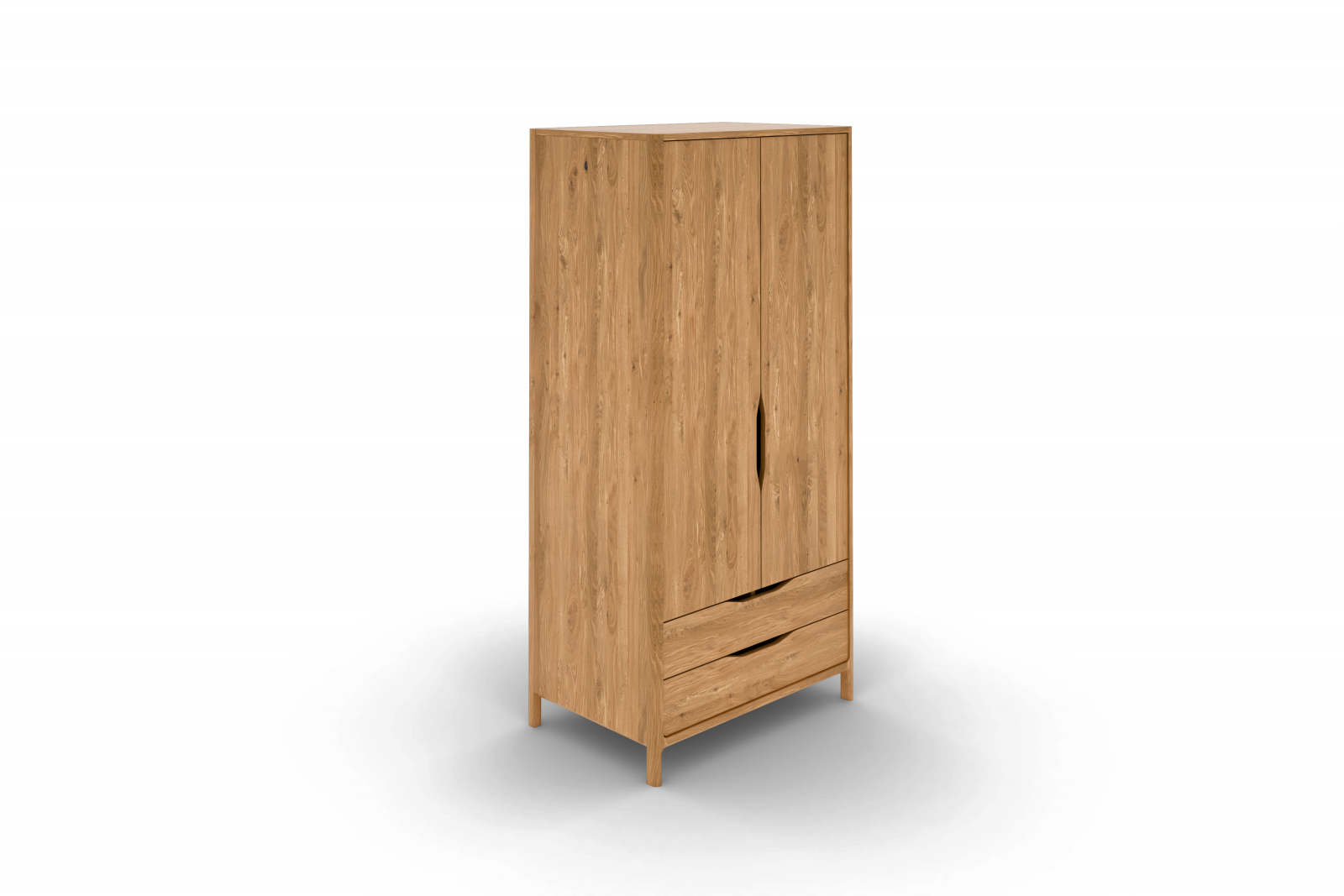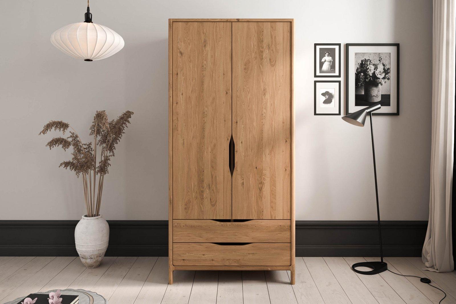Garderobeskap i massiv eik med dører og skuffer.