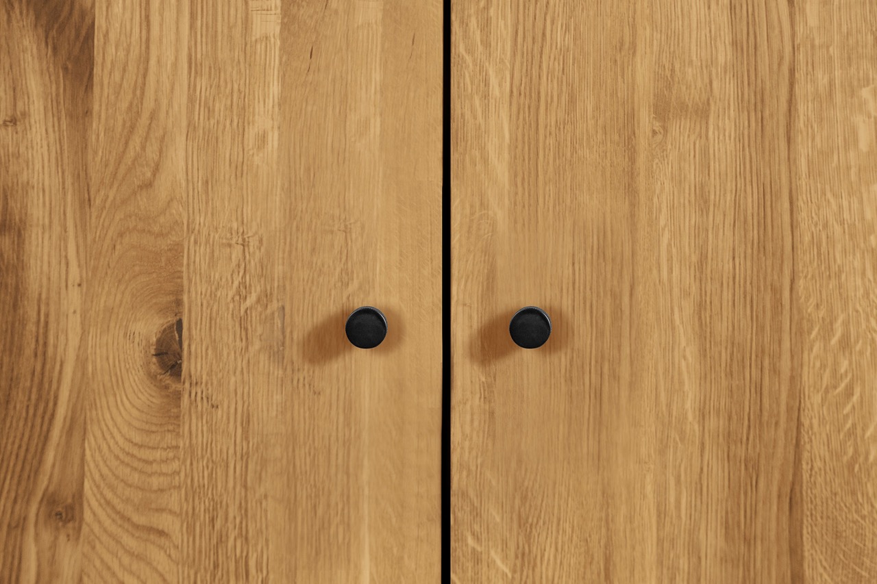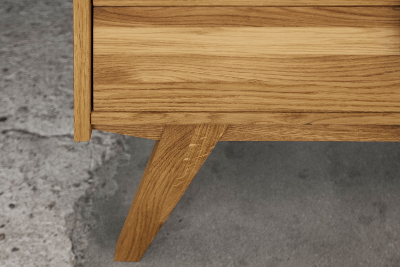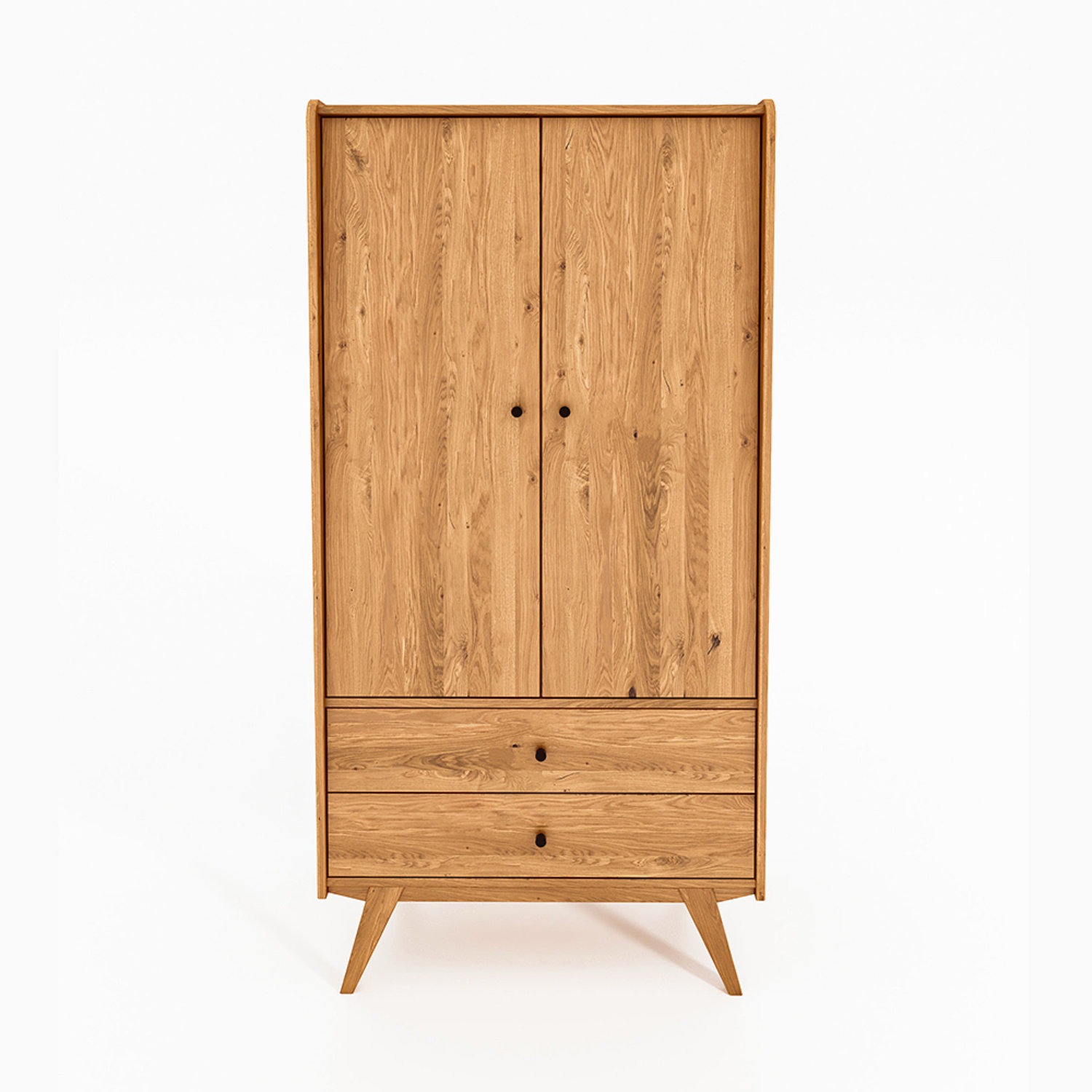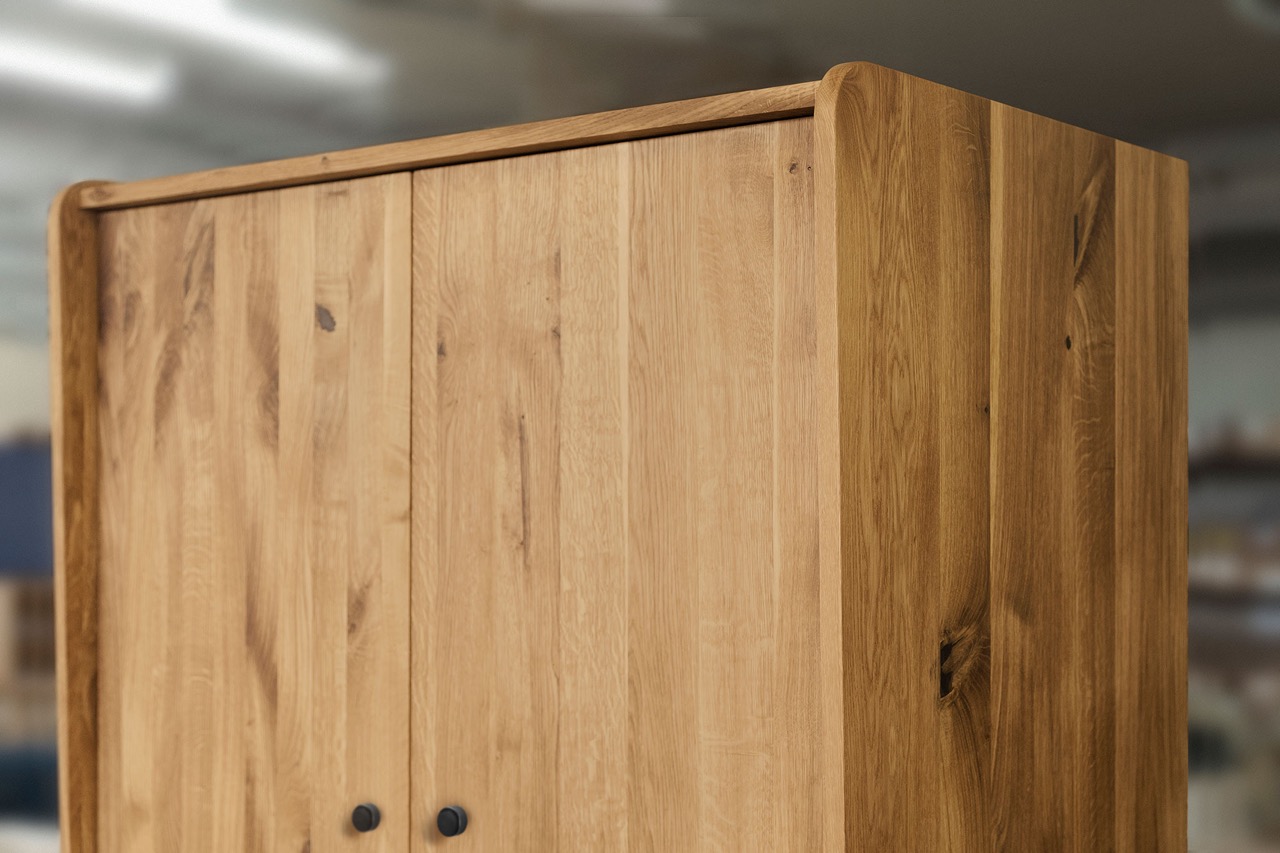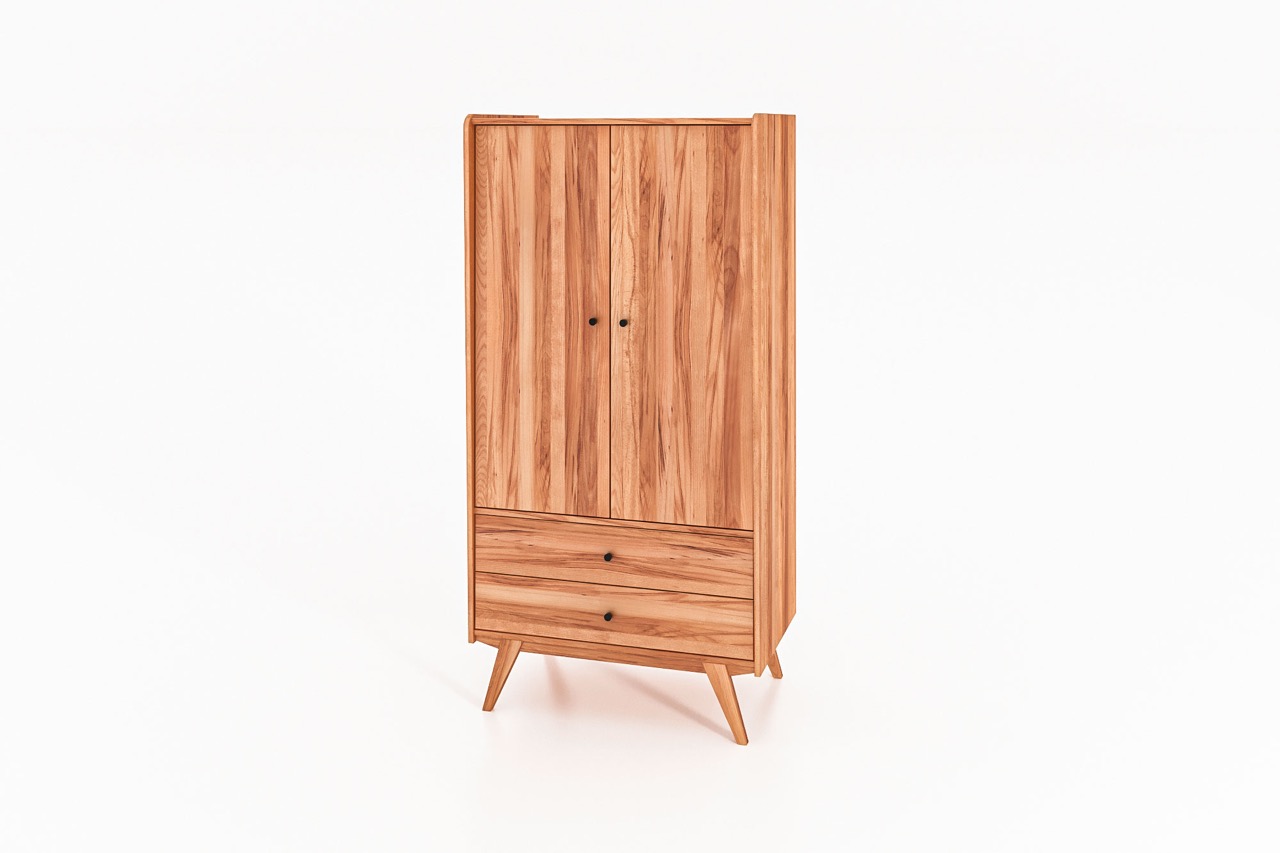 De skråstilte benene og myke hjørnene løfter det visuelle uttrykket og gjør skapet både lett og karakterfullt. Fremstilt i massivt, oljet tre og med gjennomtenkte detaljer som fine grep og harmoniske proporsjoner fremstår garderobeskapet som et naturlig midtpunkt i innredningen.