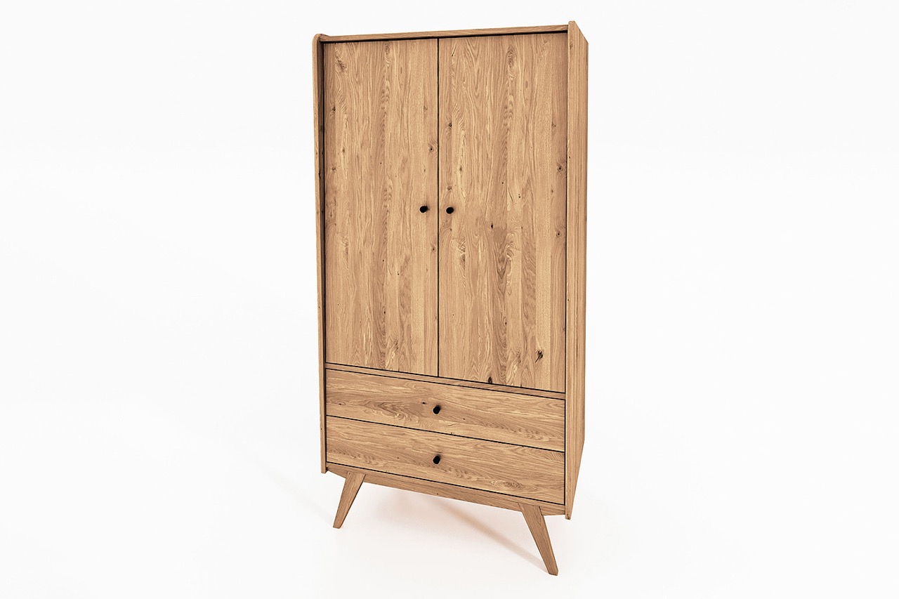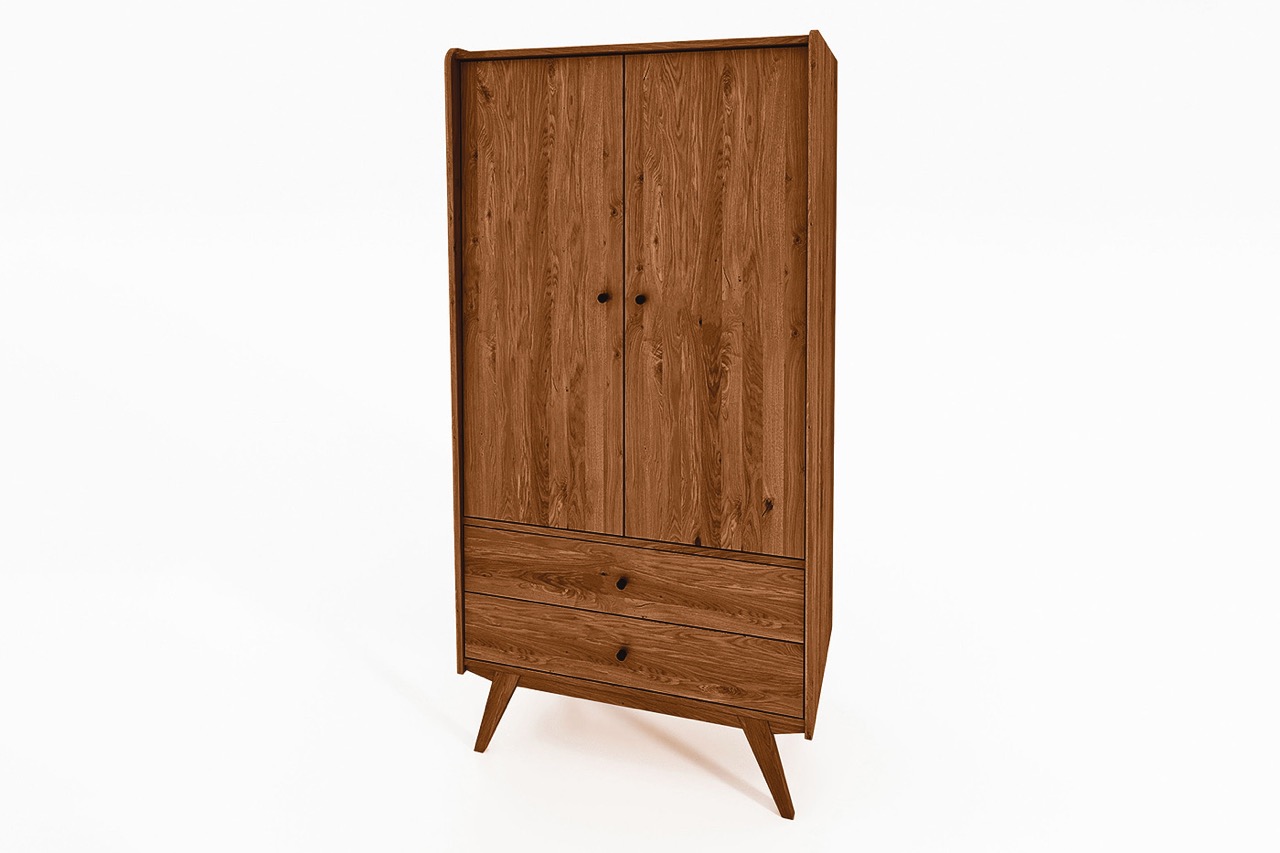 Garderobeskapet fra RETRO-serien bringer orden og eleganse inn i soverommet eller entréen. Med to høye dører og to romslige skuffer forener det oppbevaring med et formspråk som balanserer mellom nostalgi og moderne enkelhet.
