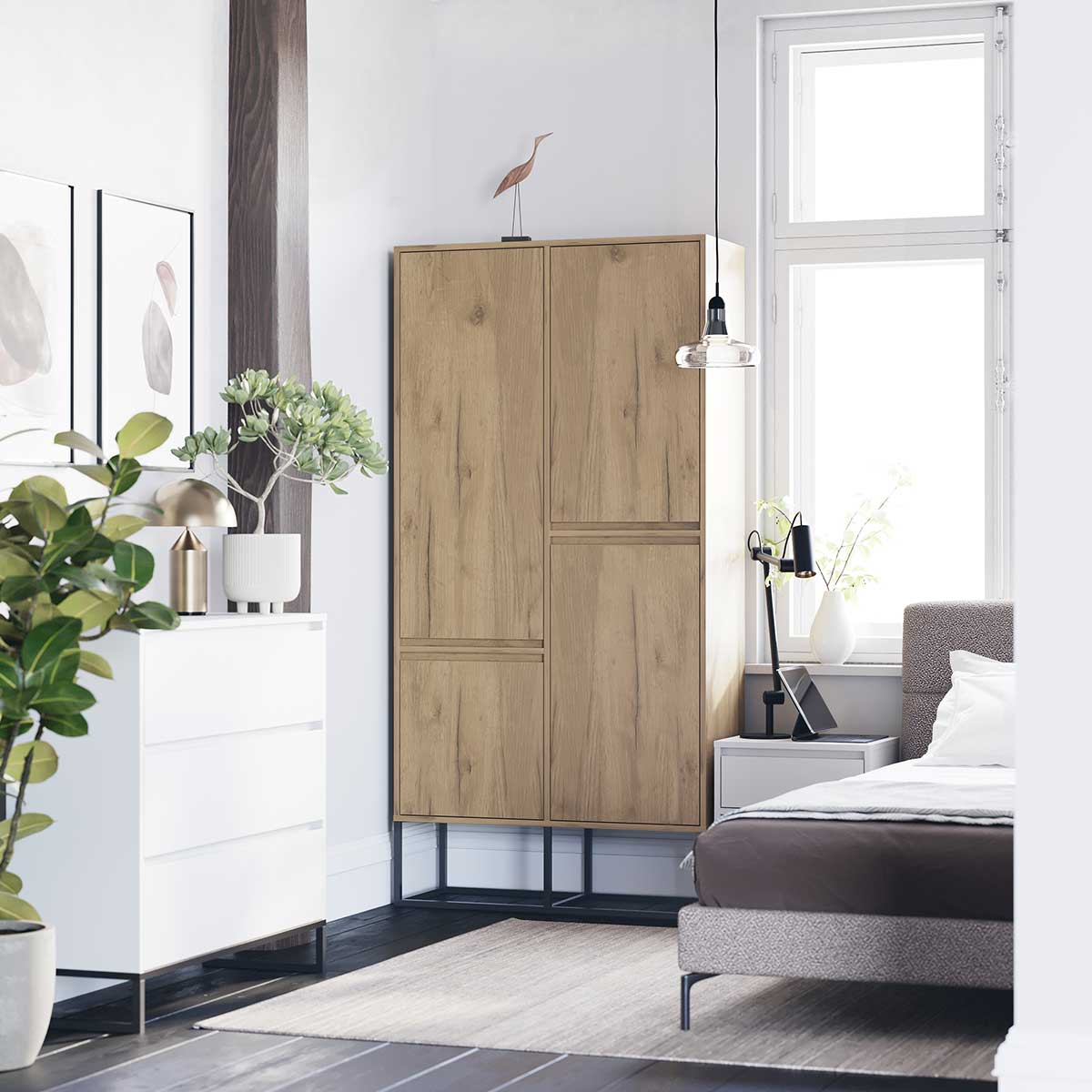 Denne modellen fra ODIS-kolleksjonen kombinerer stor oppbevaringsplass med et originalt uttrykk inspirert av moderne skandinavisk design. Den slanke høyden gir rom for både klær på henger og plagg på hyller, samtidig som skapet tilfører interiøret et elegant preg.