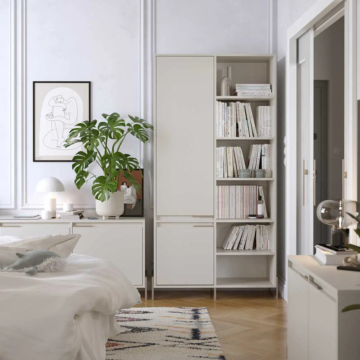 Minimalistisk garderobeskap med to dører og fem åpne hyller.