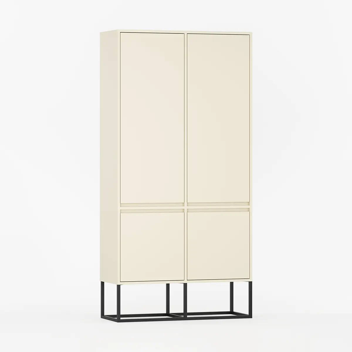 De kraftige metallprofilene erstatter tradisjonelle ben og gir skapet et tydelig formspråk, samtidig som den veggfaste konstruksjonen sikrer stabilitet. Modellen kan bestilles i ønsket bredde, dybde og farge, tilpasset hjem eller kontor.
