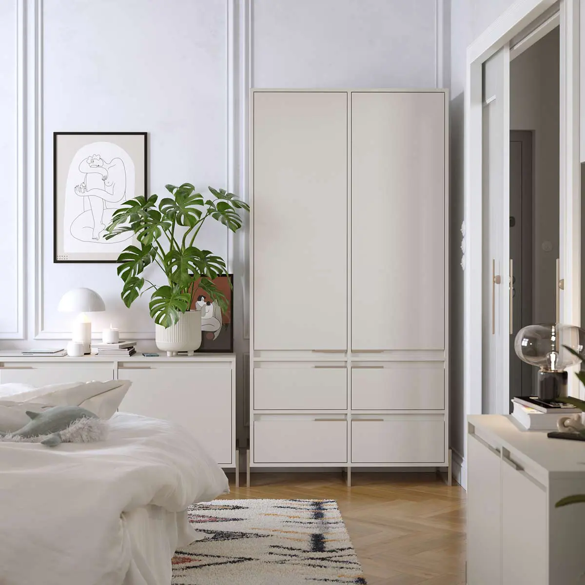 Denne modellen kombinerer minimalistisk design med stor fleksibilitet, og fungerer like godt i entré og soverom som i stue med åpen kjøkkenløsning. Den harmoniske formen, inspirert av skandinavisk estetikk, gir en visuell letthet samtidig som skapet rommer nok til å dekke mange behov i hverdagen.