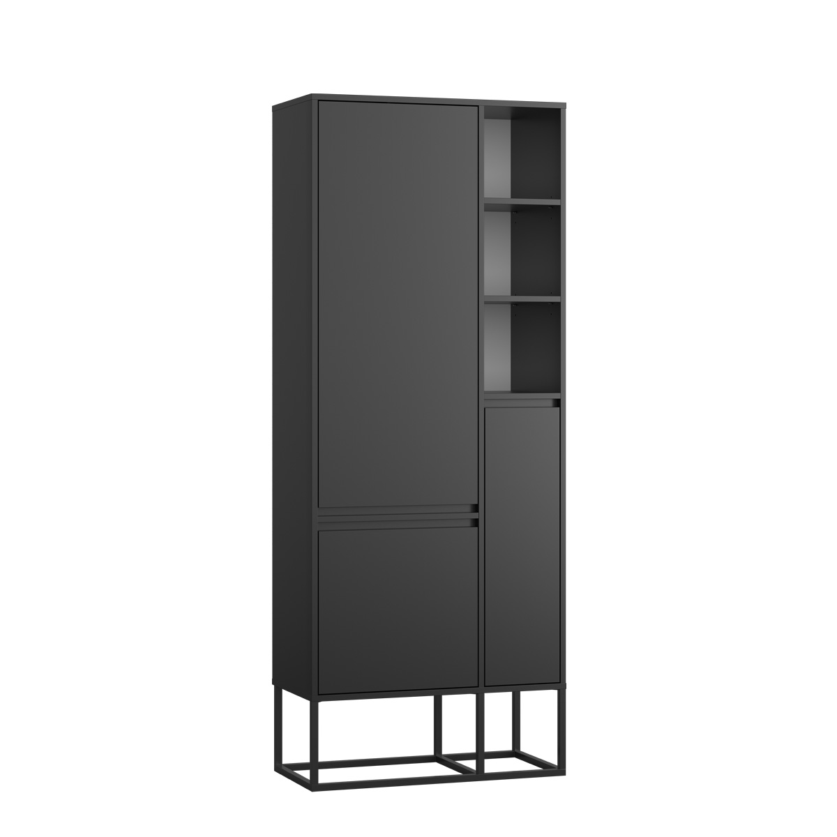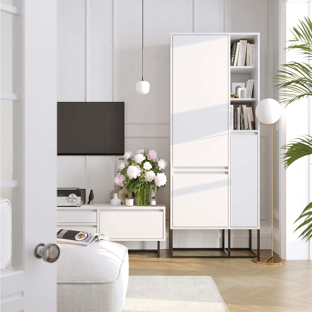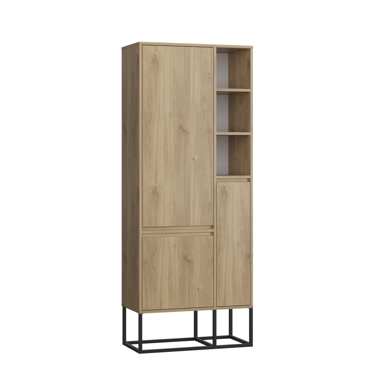 Øverst suppleres skapet av tre åpne rom med flyttbare hyller, ideelle for bøker, dekor eller andre ting du ønsker å vise frem. Den balanserte kombinasjonen av lukket oppbevaring og åpne flater gir fleksibilitet i hverdagen.