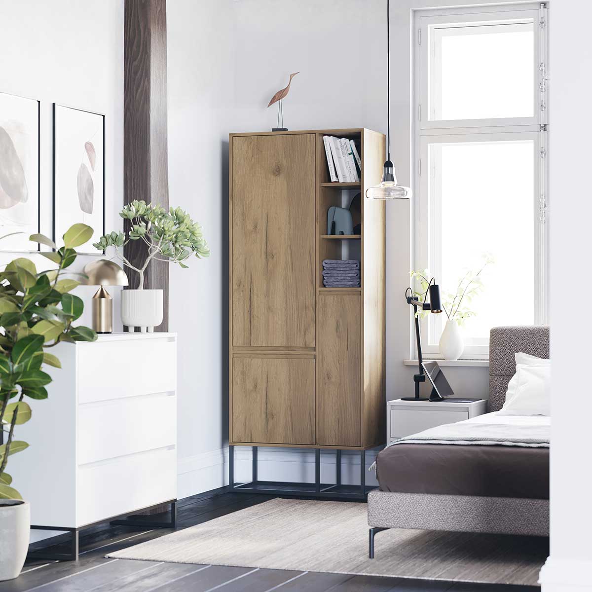 Metallprofilene som erstatter tradisjonelle ben gir stabilitet og et lett, industrielt preg. Bak dørene finner du to rom med justerbare hyller og ett rom med garderobehenger, perfekt for både hengende og brettede klær.