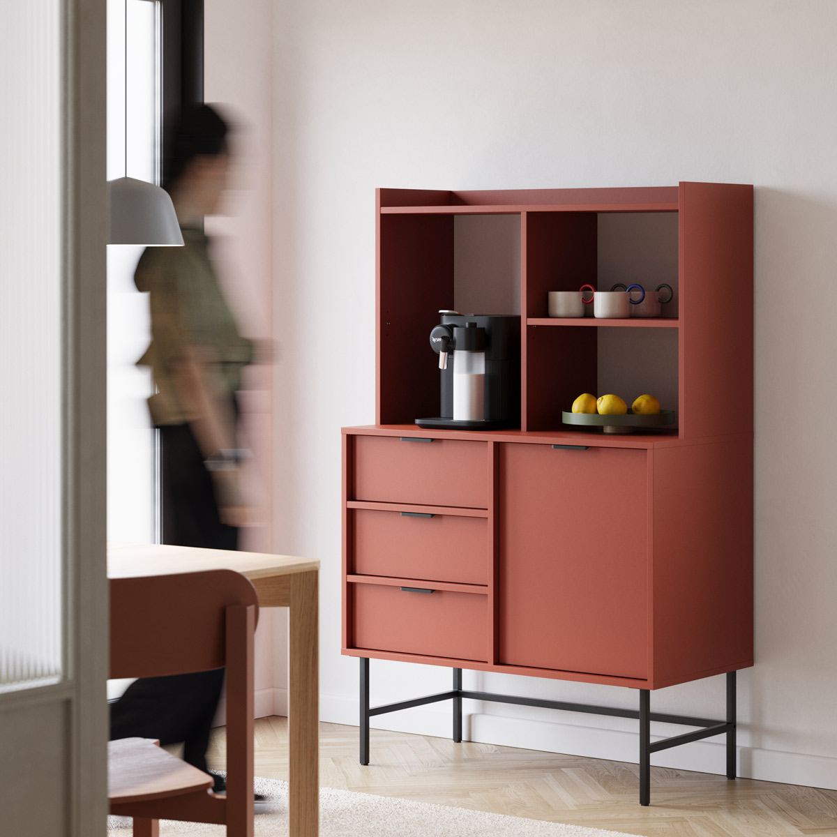 Høy skjenk med skuffer, skap og åpne hyller.