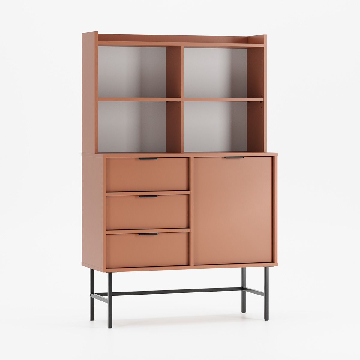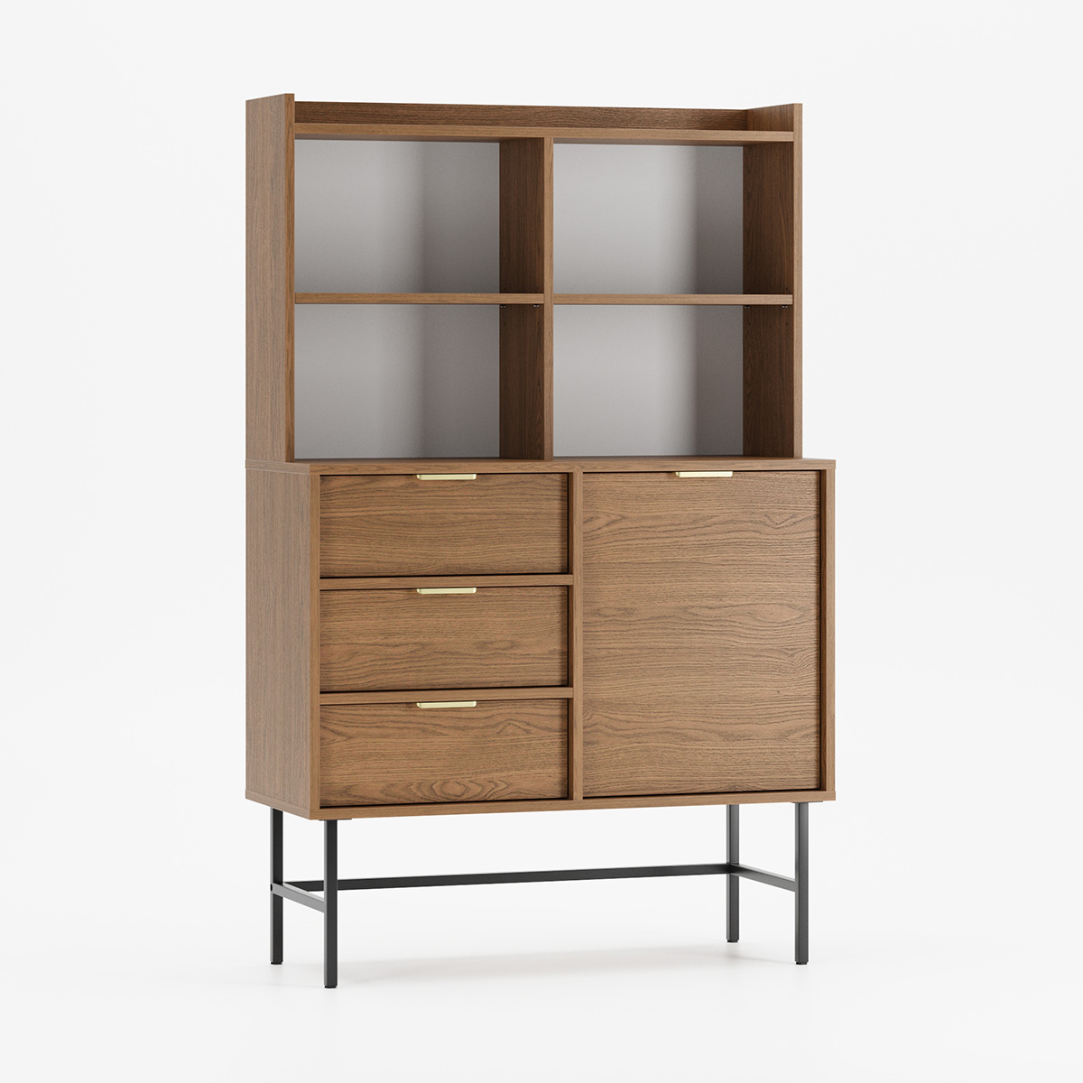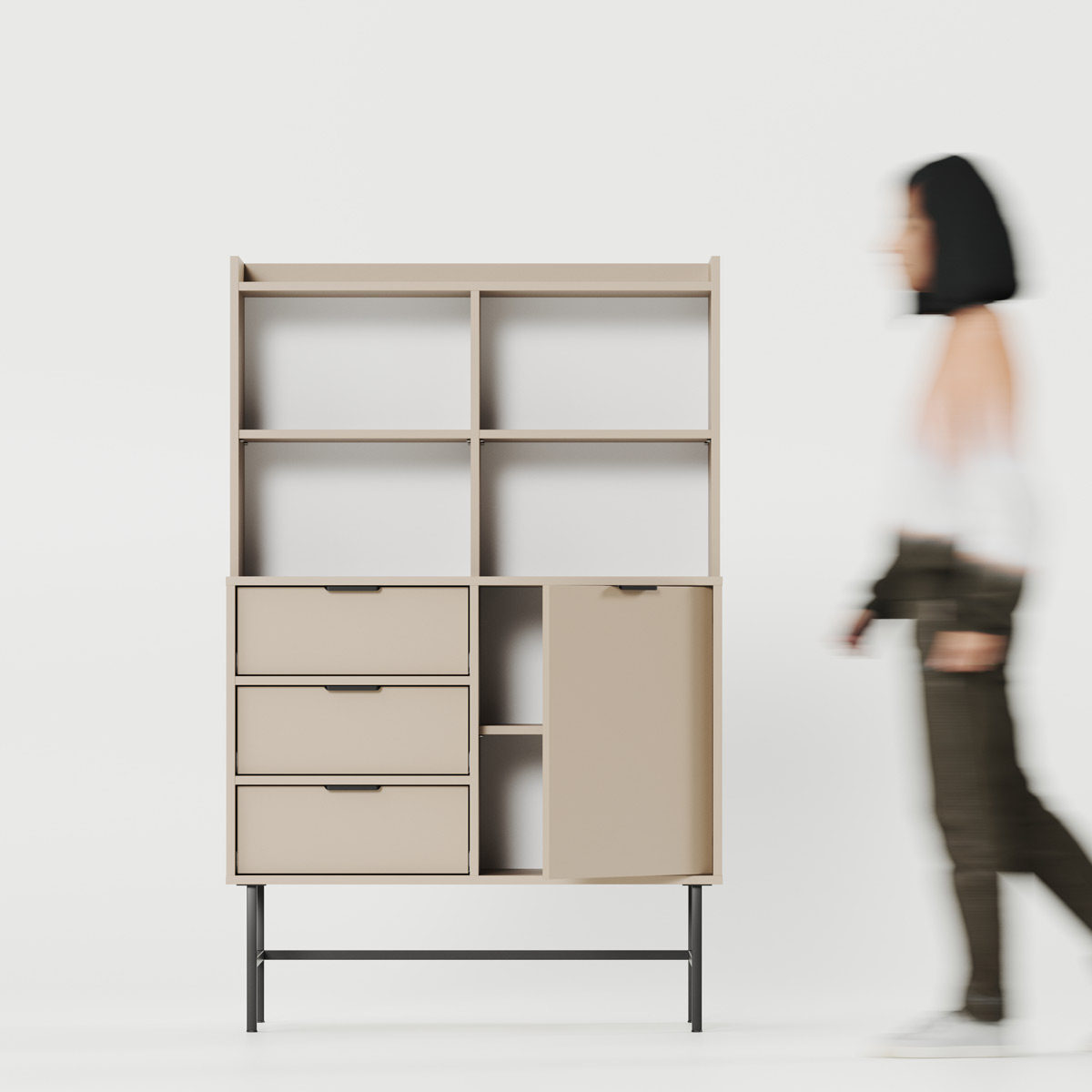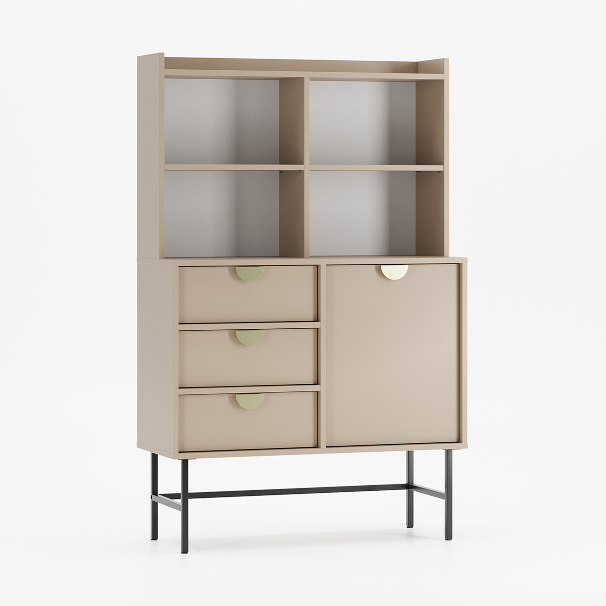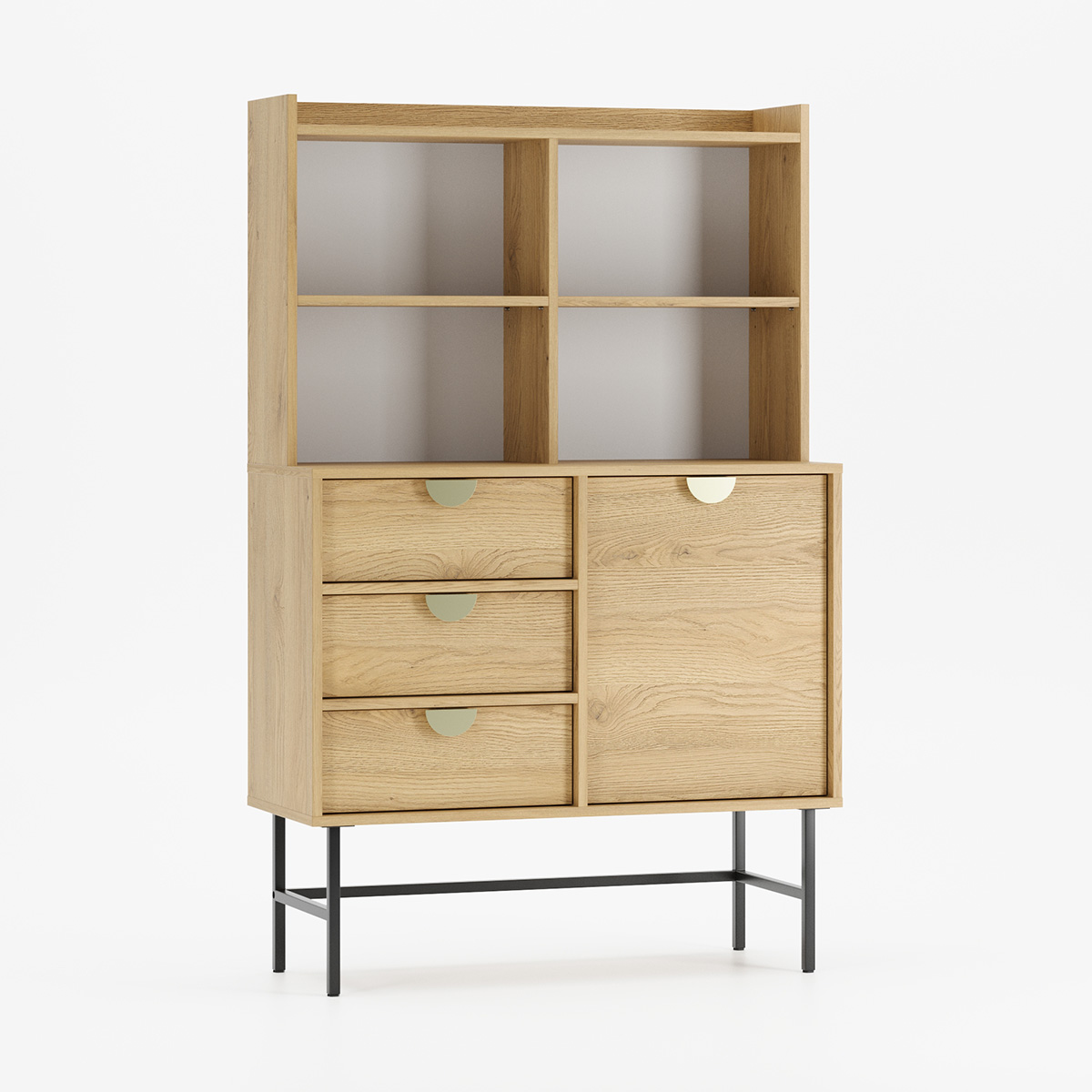 SIGI KRSN02 kombinerer åpen utstilling med systematisk oppbevaring i et harmonisk design. Øverste del delt i fire åpne rom med to justerbare hyller gir perfekt plass til bøker eller dekorasjon, mens nederste del med tre skuffer og ett sidehengslet skap skaper praktisk organisering.