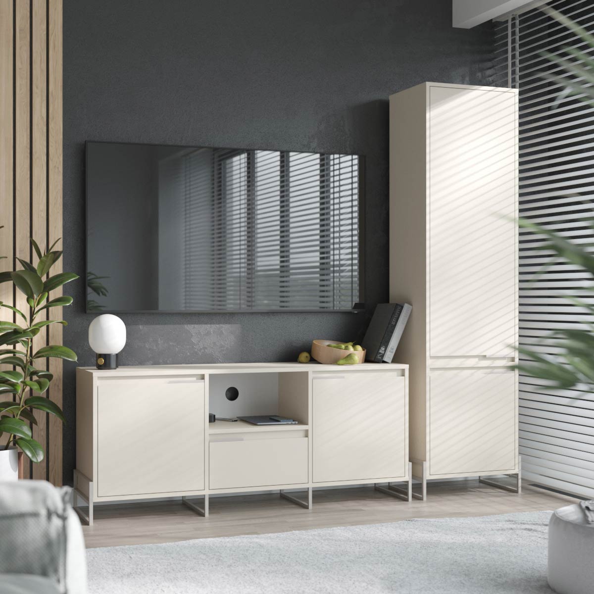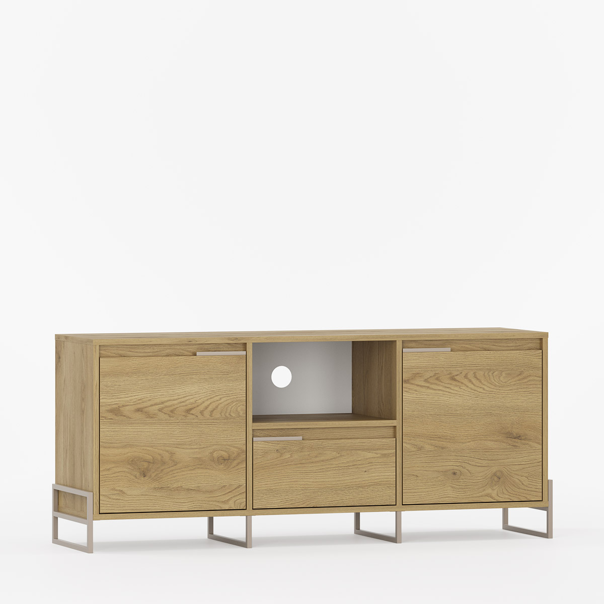 To rom med justerbare hyller bak dører gir god kapasitet til oppbevaring, mens midtseksjonen har en åpen hylle og en skuff som gir fleksibilitet for medieutstyr og tilbehør. De integrerte håndtakene understreker det rene designet, og den solide konstruksjonen med stålprofiler sørger for trygg stabilitet.