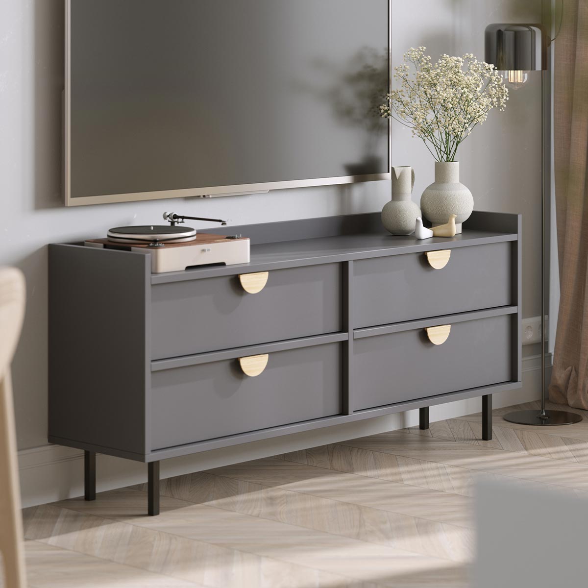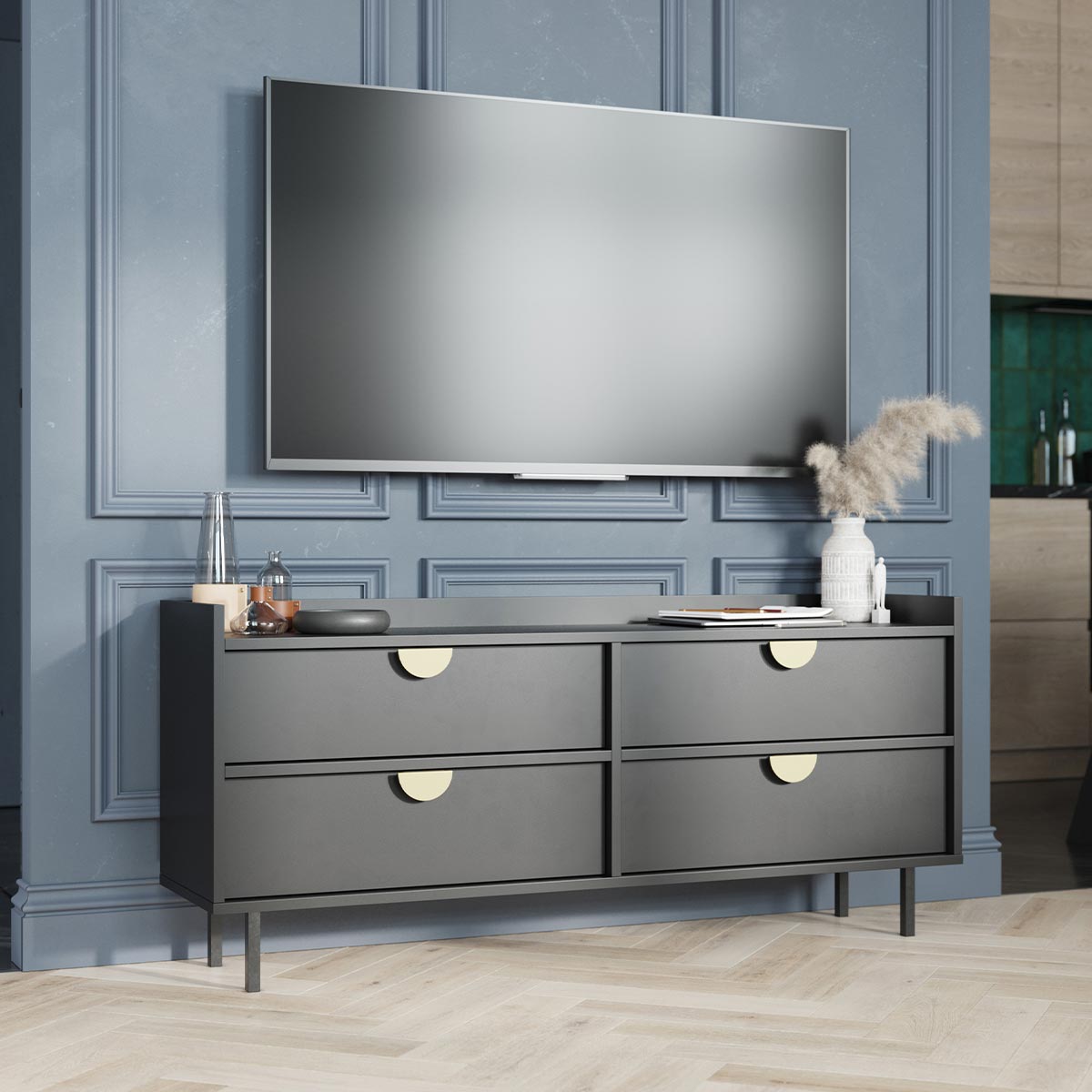 Moderne TV-bord med fire skuffer.