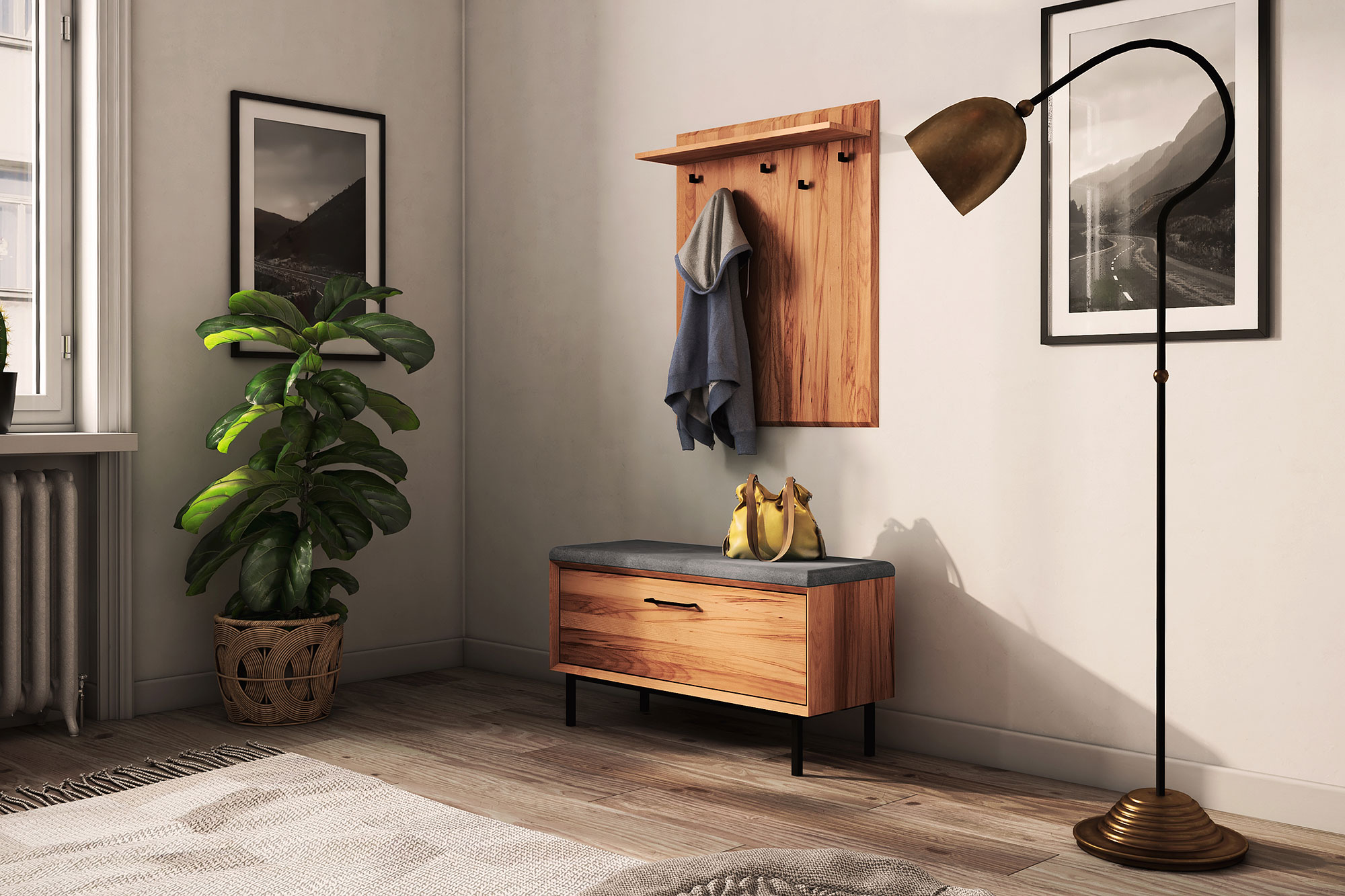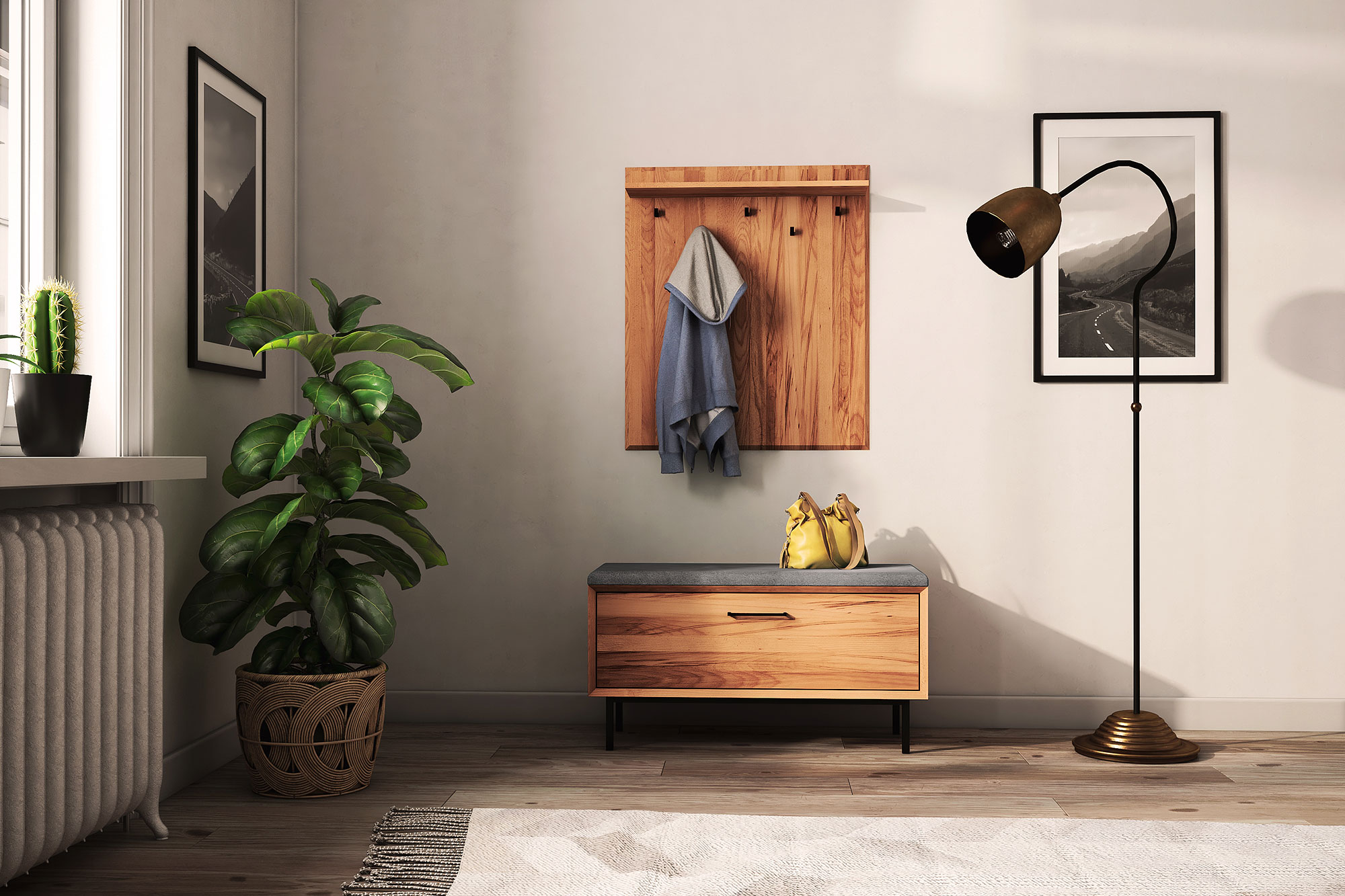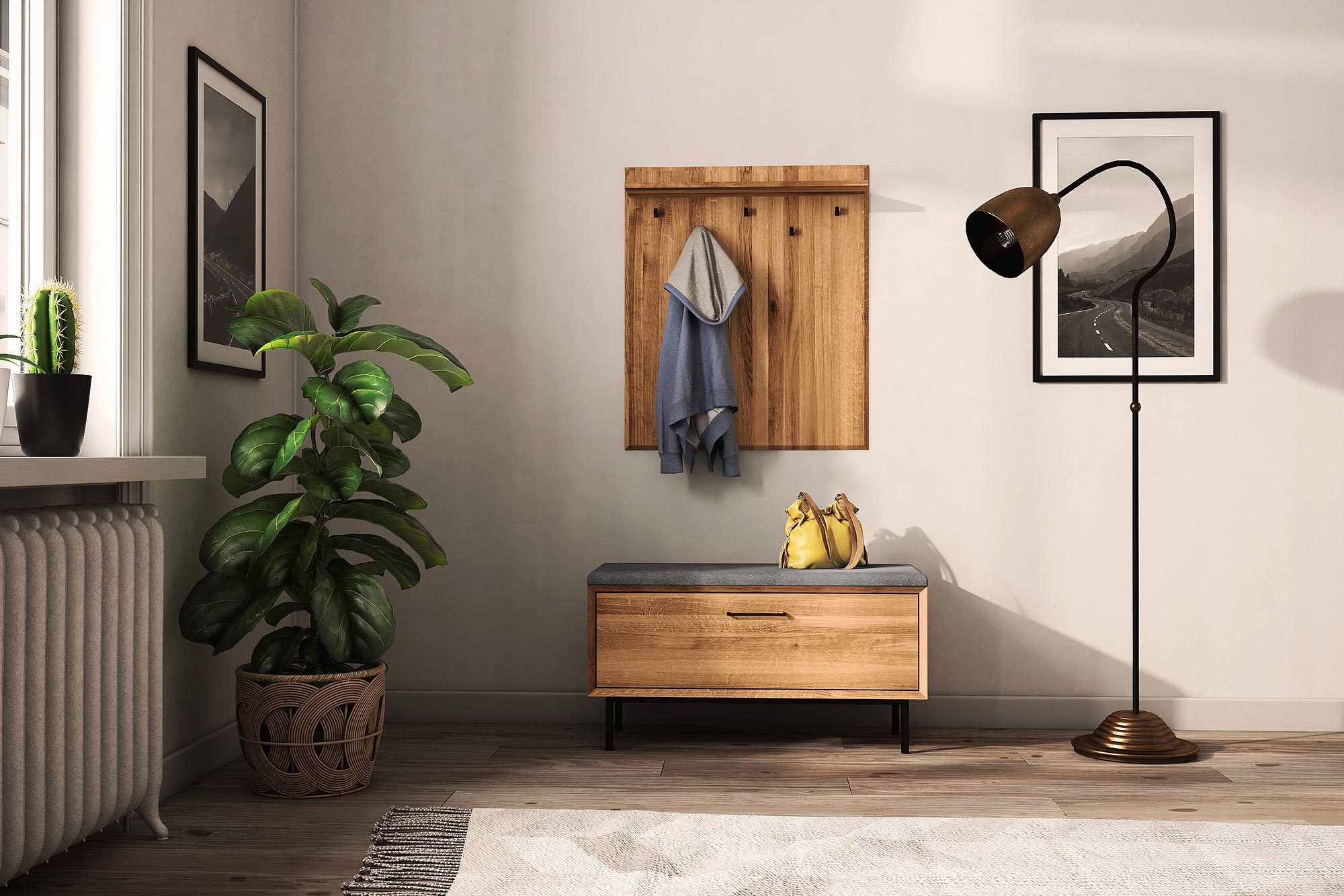 Den øvre hattehyllen gir ekstra plass til vesker eller småting, mens de sorte knaggene holder orden på jakker og skjerf. Et enkelt, men gjennomtenkt møbel for entréen.