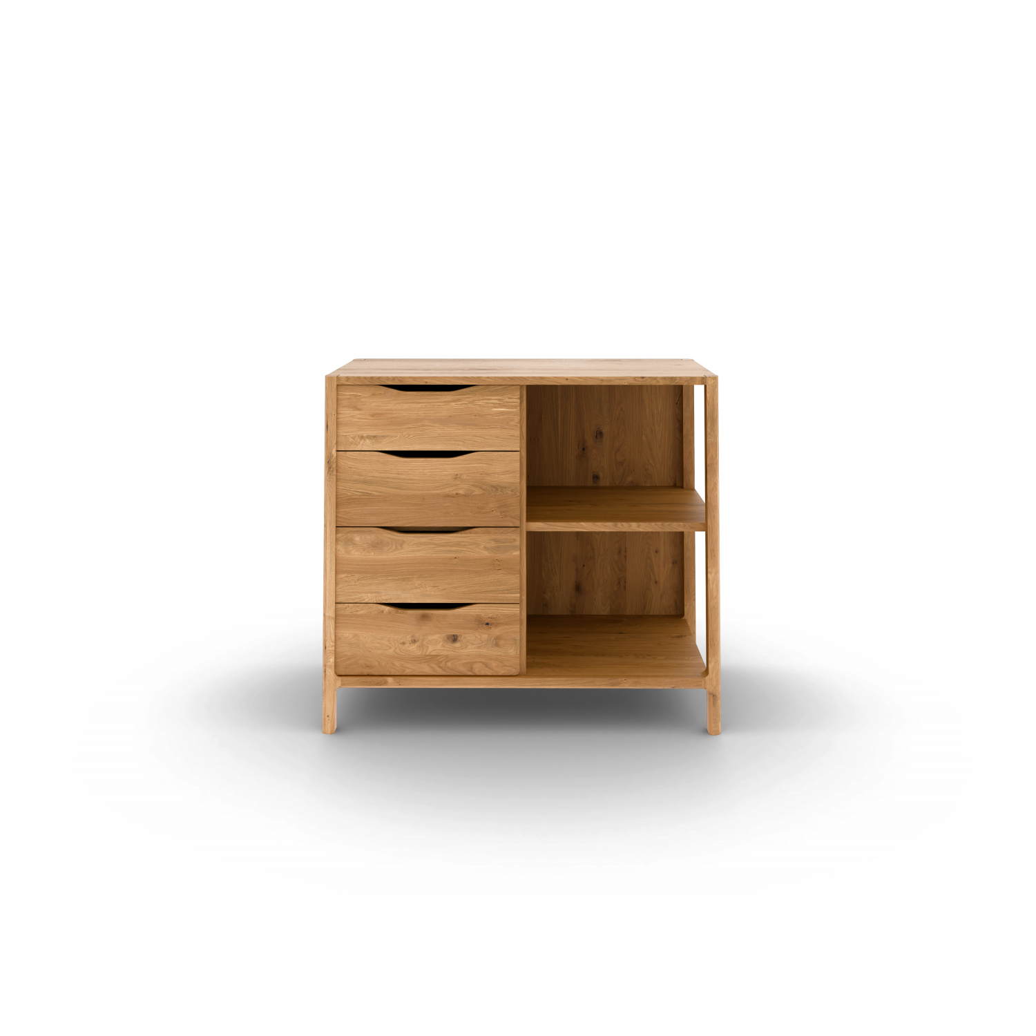 Med 4 skuffer og en åpen side med to hyller får du både skjult og synlig oppbevaring i ett estetisk møbel. En perfekt løsning til rom hvor du vil organisere – uten å lukke alt inne.