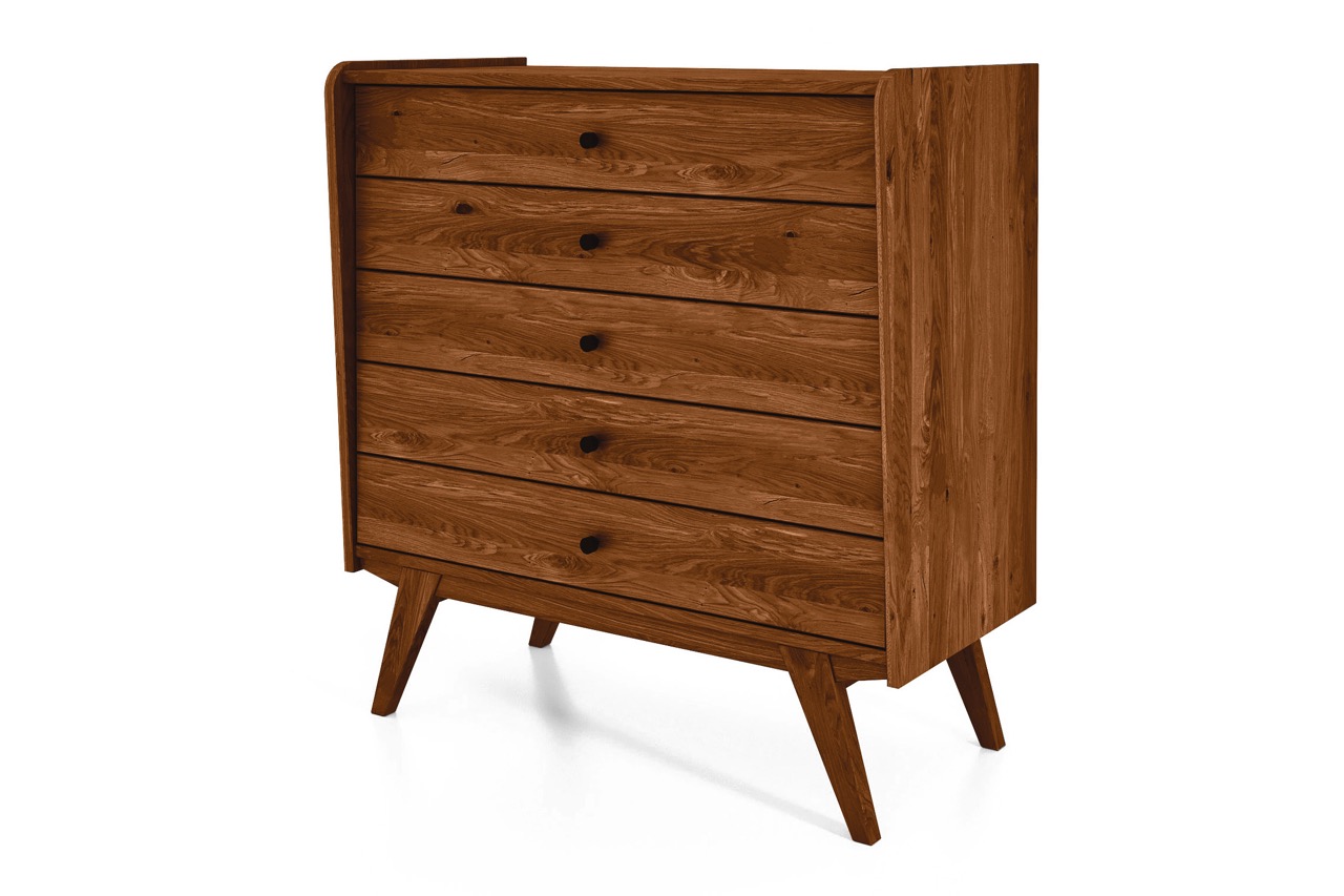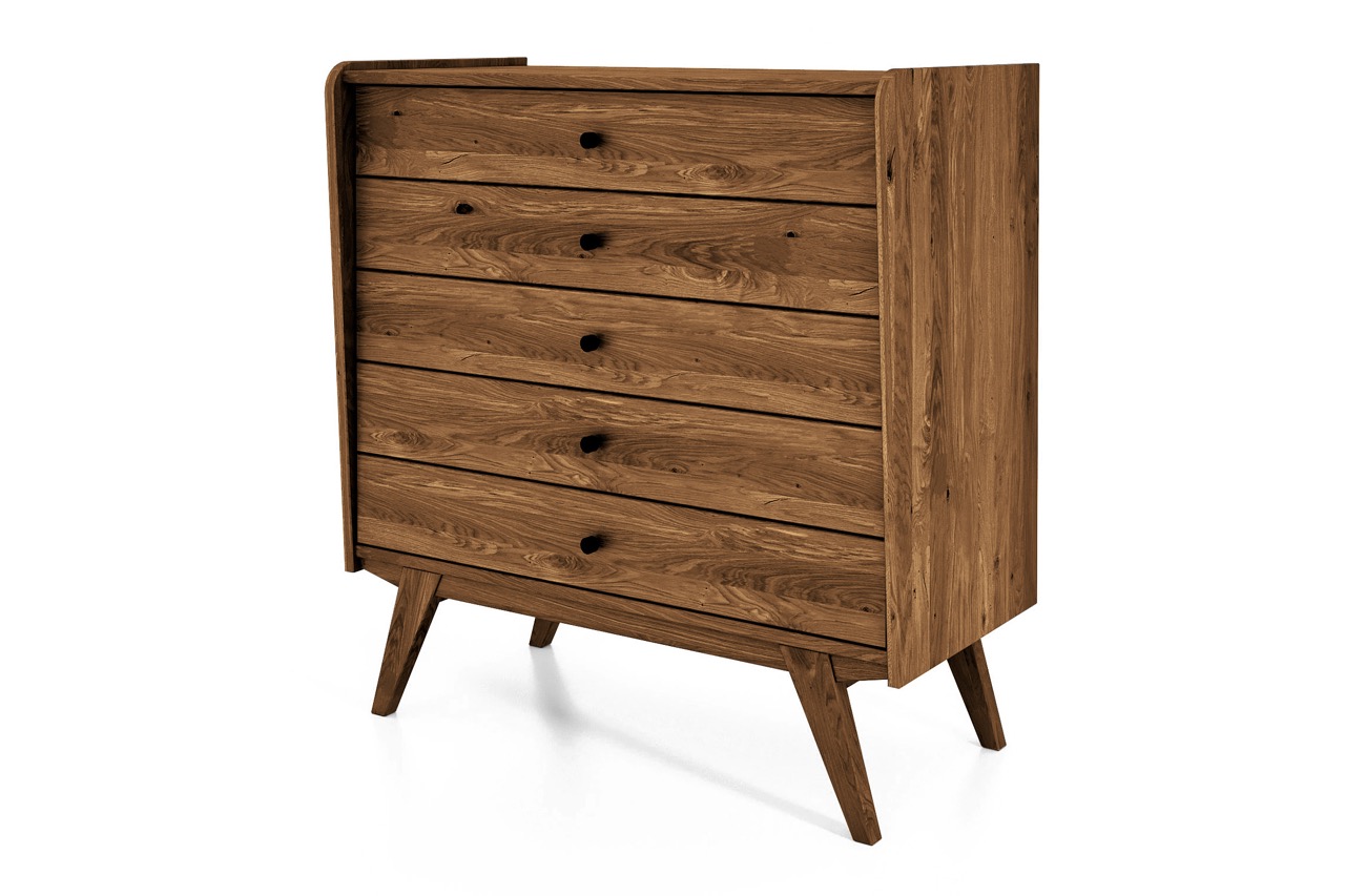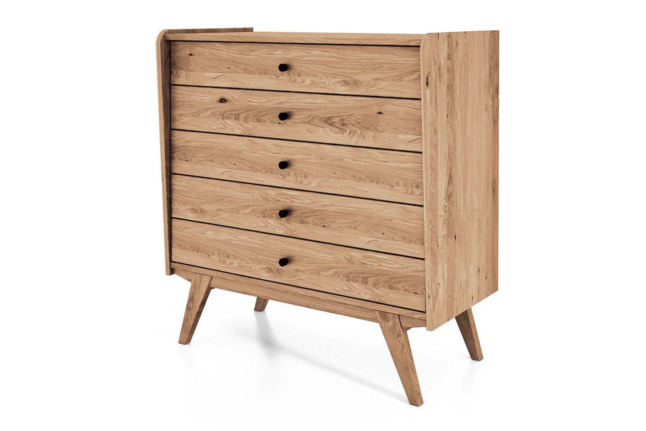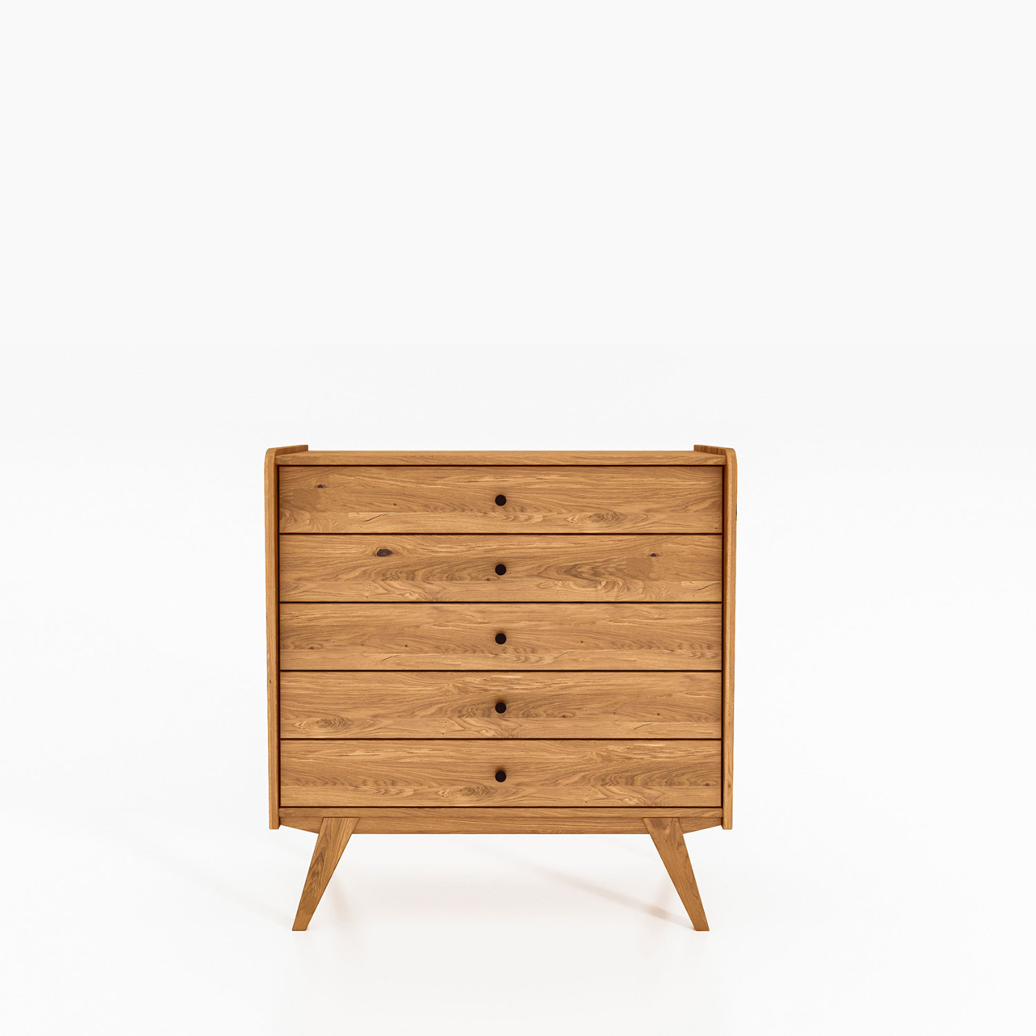 Denne romslige kommoden fra RETRO-serien er designet for deg som ønsker funksjonell oppbevaring med et estetisk løft. De fem brede skuffene gir god plass til alt fra klær og tekstiler til hverdagens småting – pakket inn i et tidløst formspråk.