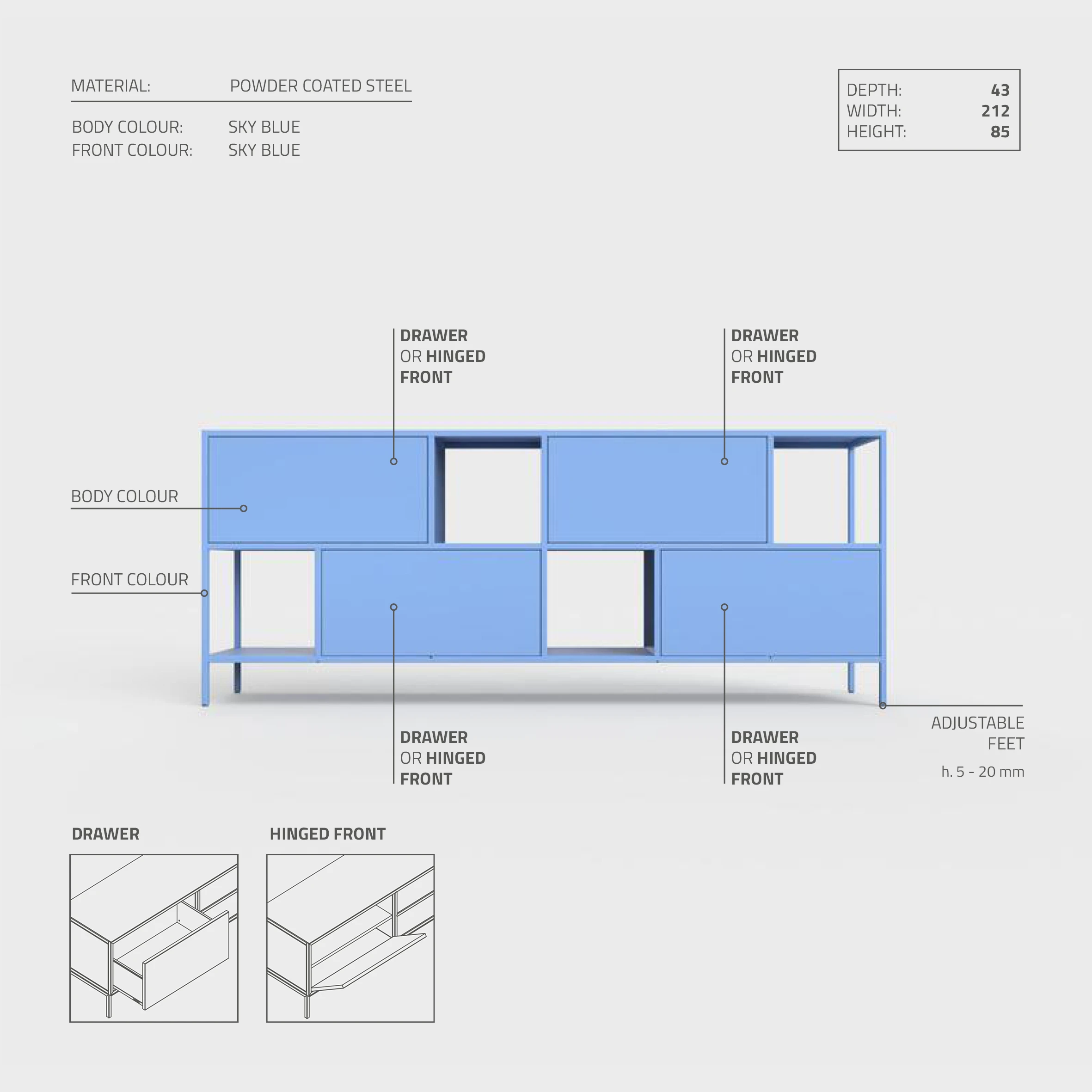 Hos DESIVA får du full frihet til å skape et møbel som passer din stil. Velg blant over 40 pulverlakkerte farger – slitesterk kvalitetslakk fra Hellas. Overflaten er matt, sterk og motstandsdyktig mot både fukt, sollys og fingermerker. Alle møbler er laget i heltrukket stål – ramme, fronter og topp – og herdes i ovn for et varig og behagelig uttrykk. Du kan også velge fargen på innsiden: 10 nyanser på de glatte, innvendige platene gjør at skapet føles riktig – hver gang du åpner det.