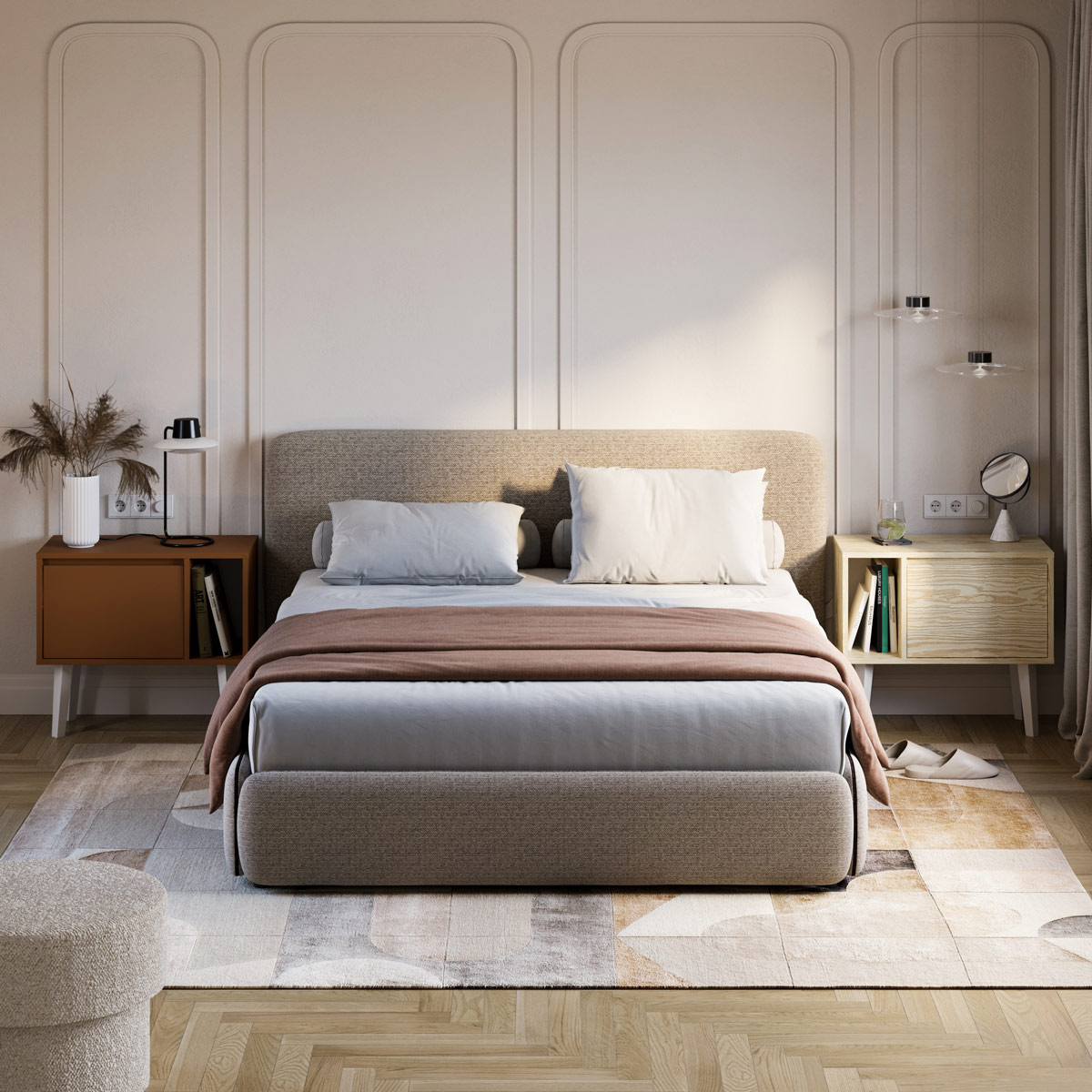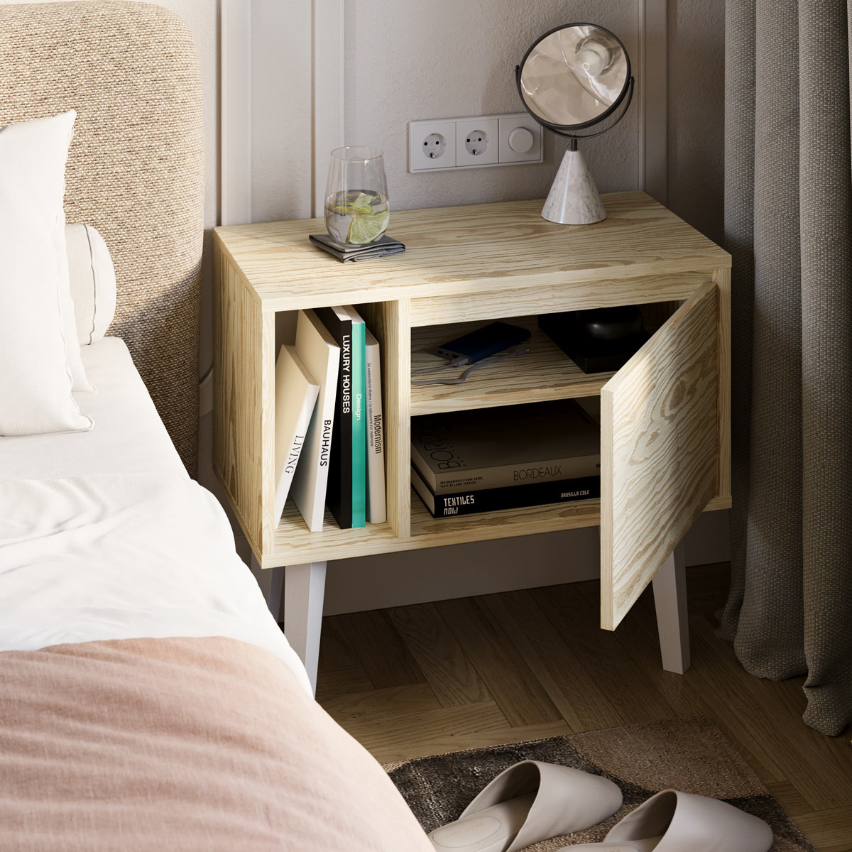 Bak døren finner du god plass til bøker og småting du vil ha innen rekkevidde. Topplaten passer perfekt til nattlampe, bok eller briller. Du kan selv velge farge og ben, og tilpasse uttrykket til din stil og atmosfære.