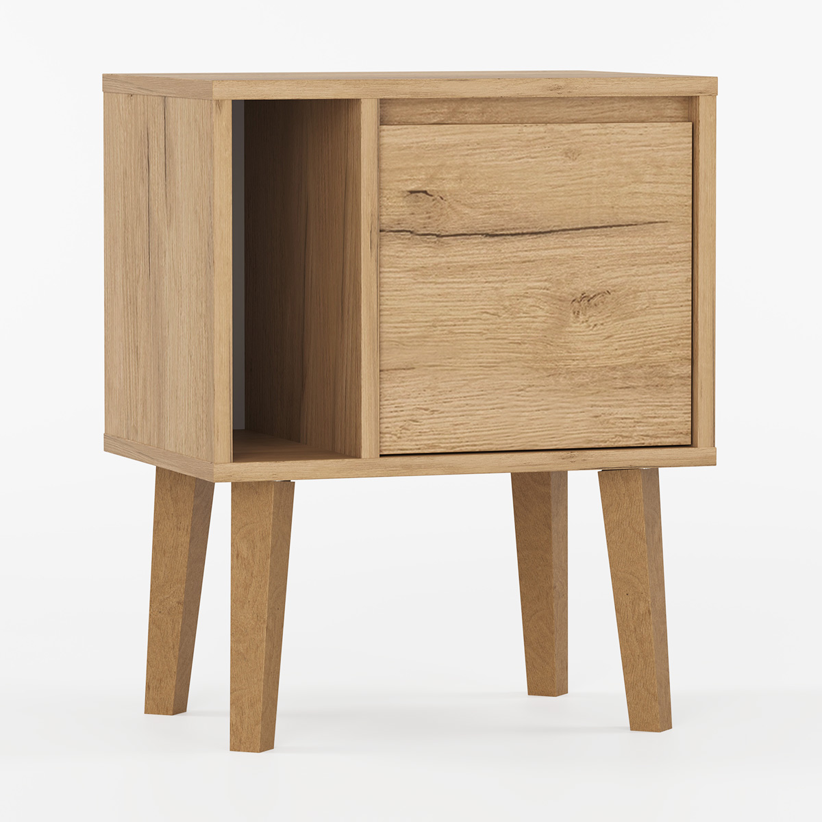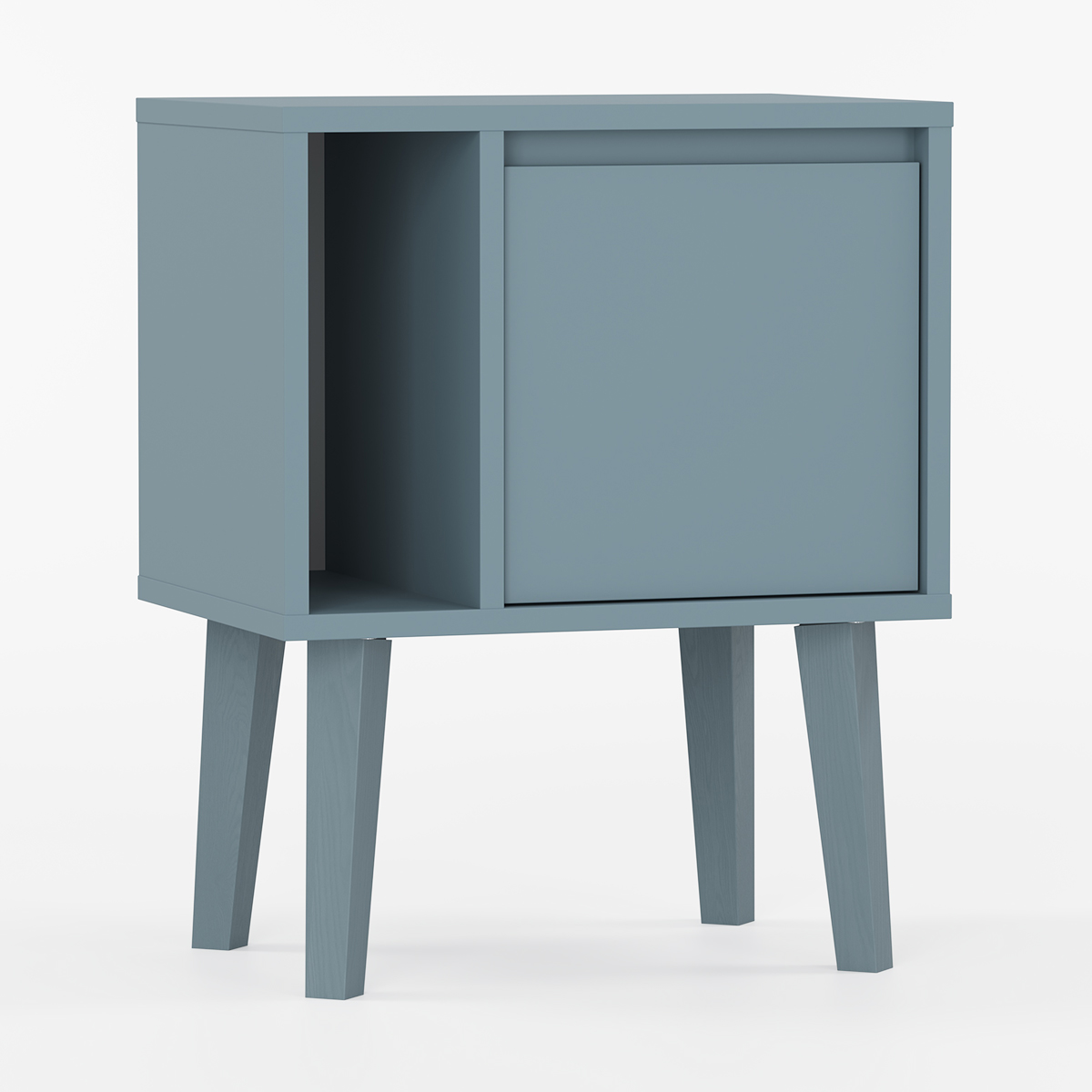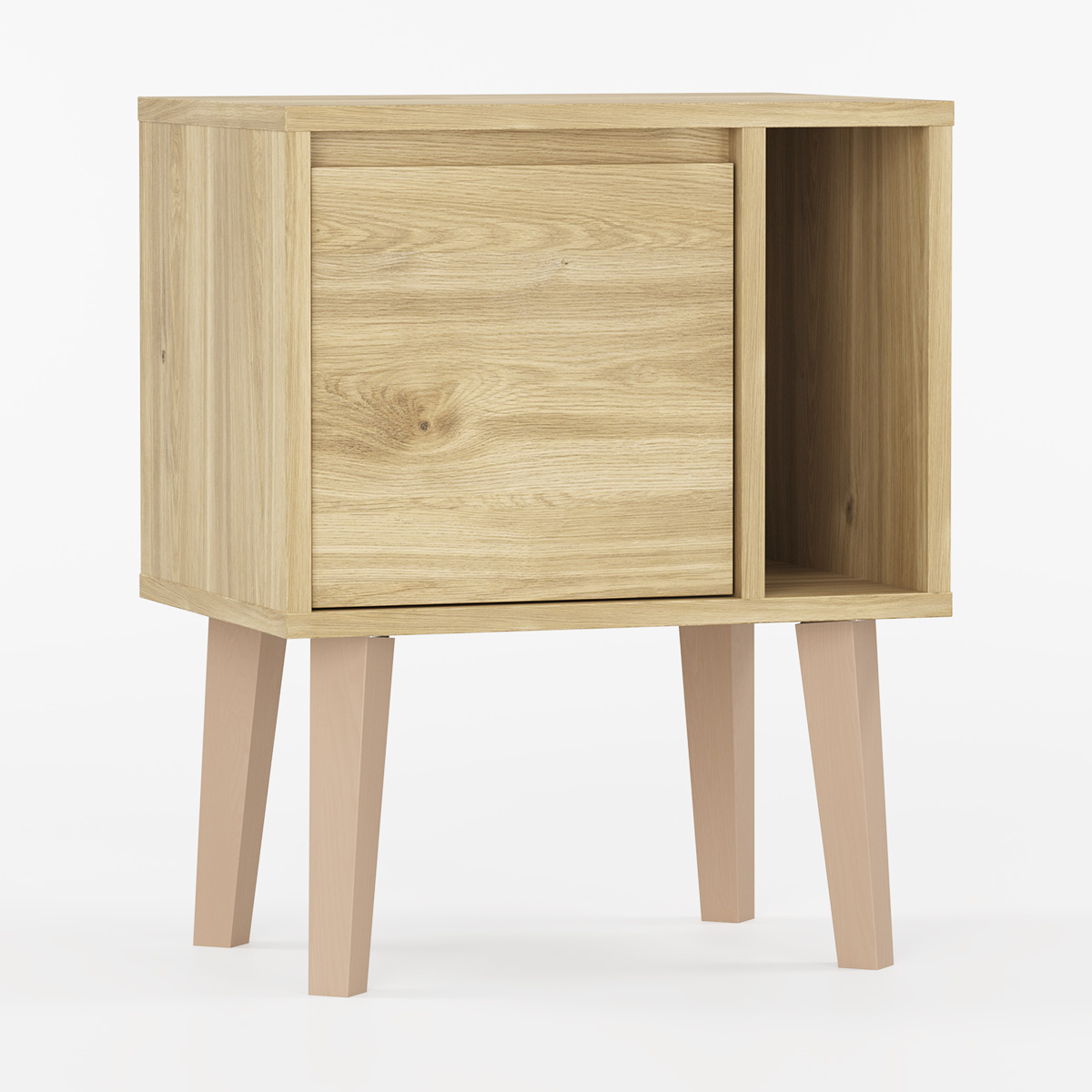 Minimalistisk nattbord med én dør og en åpen hylle.