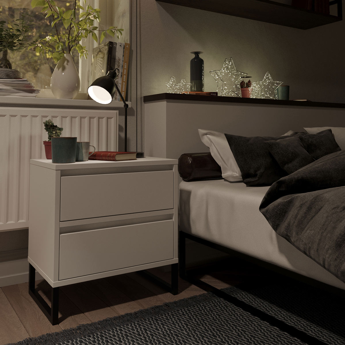 Topplaten gir plass til en nattlampe eller personlige ting, mens skuffene glir lett på BLUM-skinner og gir god oppbevaringsplass nær sengen.