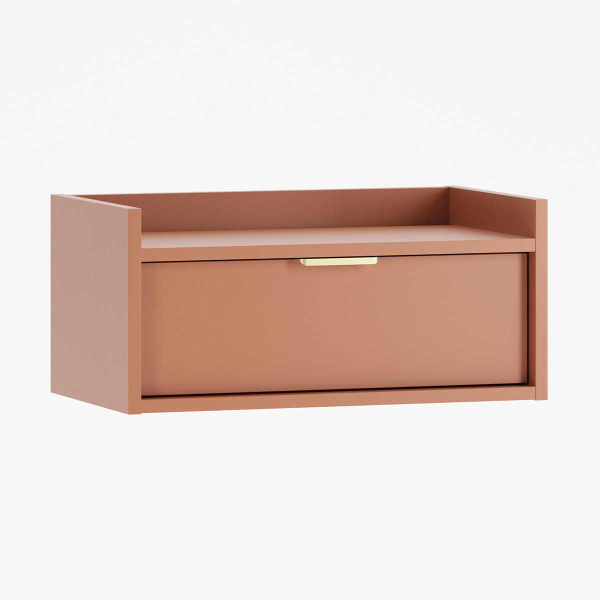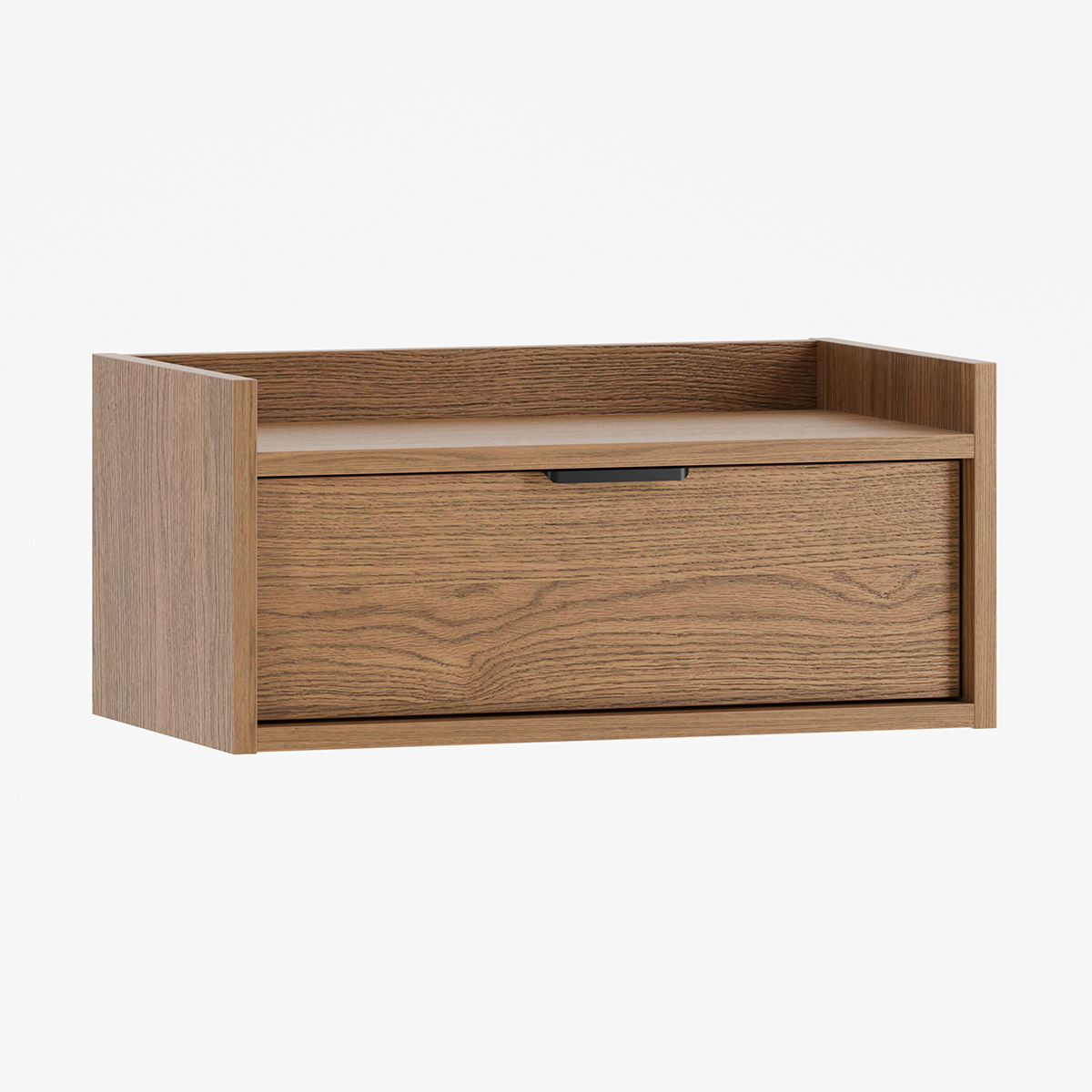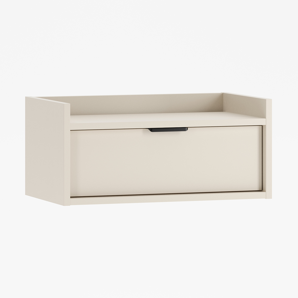 Med mulighet for å velge bredde, dybde, farge og håndtak blir det en personlig del av rommet ditt. Den praktiske topplaten med kant sikrer trygg plassering av gjenstander, mens veggmonteringen gir større fleksibilitet og gjør rengjøring enkel.