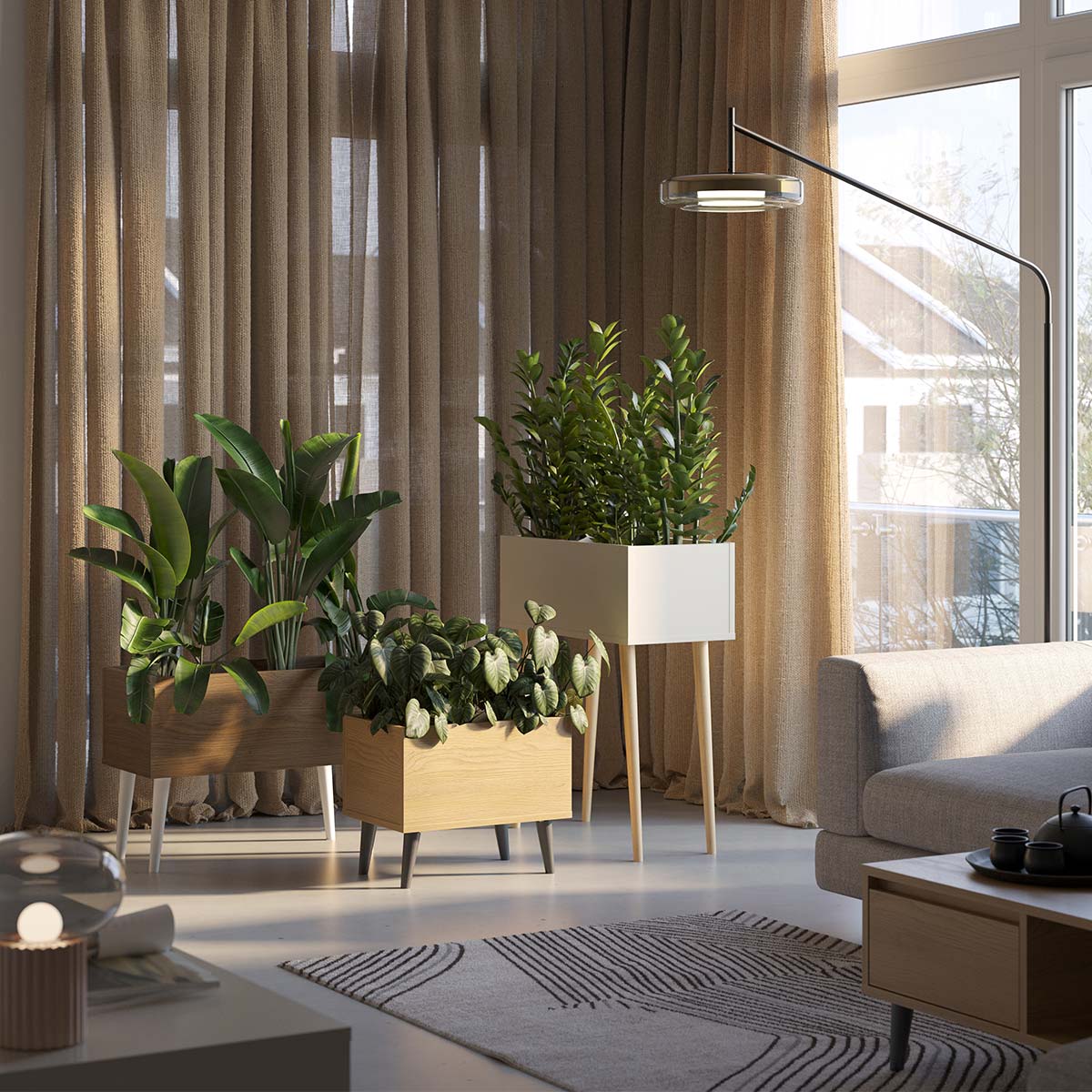 Fenris DF01 er en lav modell som løfter plantene dine uten å dominere rommet. Den skjuler potter på en elegant måte og fungerer like godt som et subtilt designelement i stue, kjøkken eller kontor.