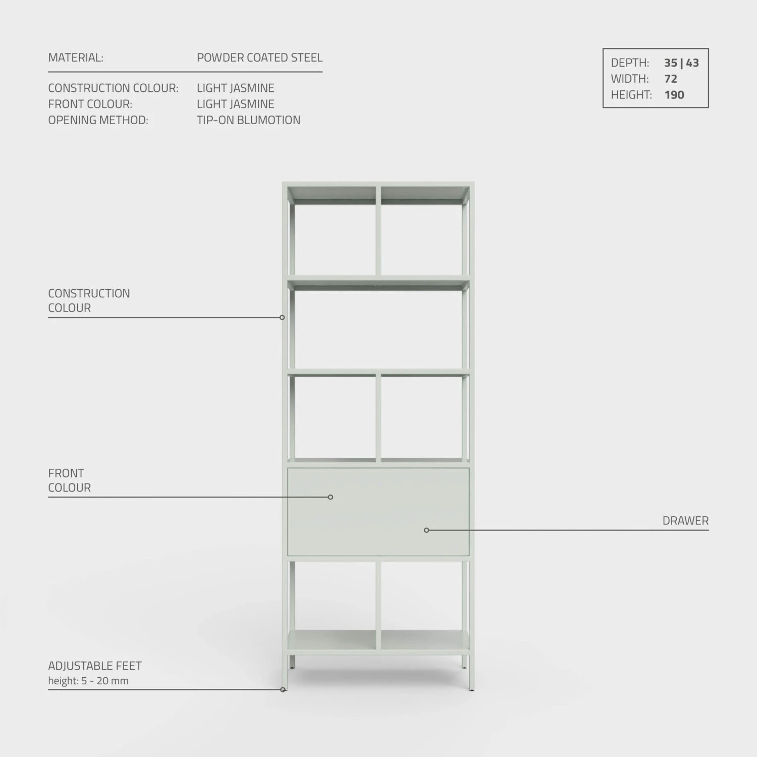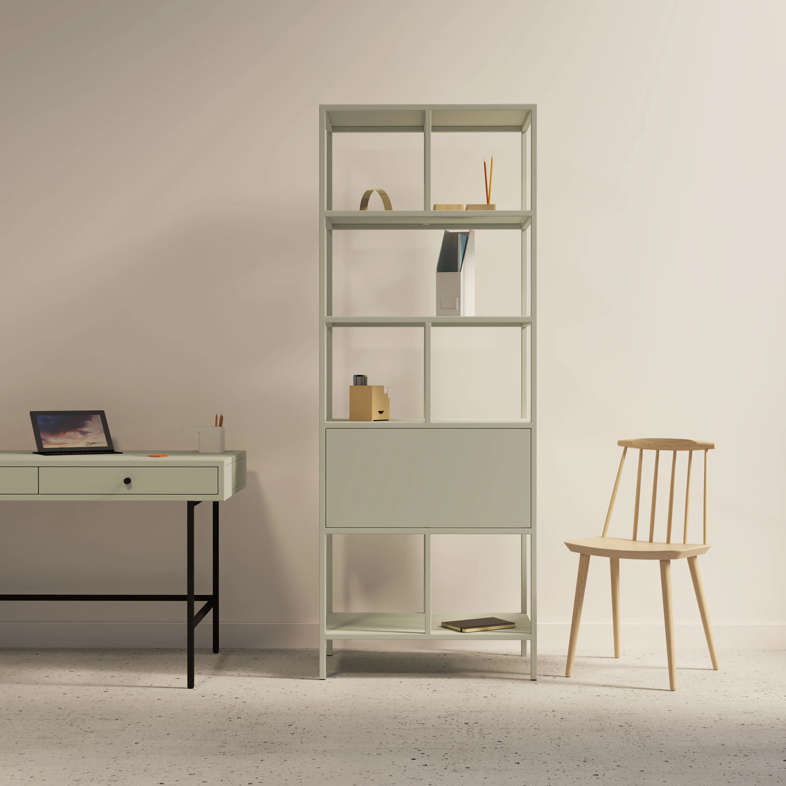 Reol LILUM 05 balanserer det åpne og det skjulte i en rolig komposisjon. De åpne hyllene gir plass til bøker, kunst og små uttrykk, mens det lukkede rommet gir deg mulighet til å gjemme det som ikke trenger å vises.