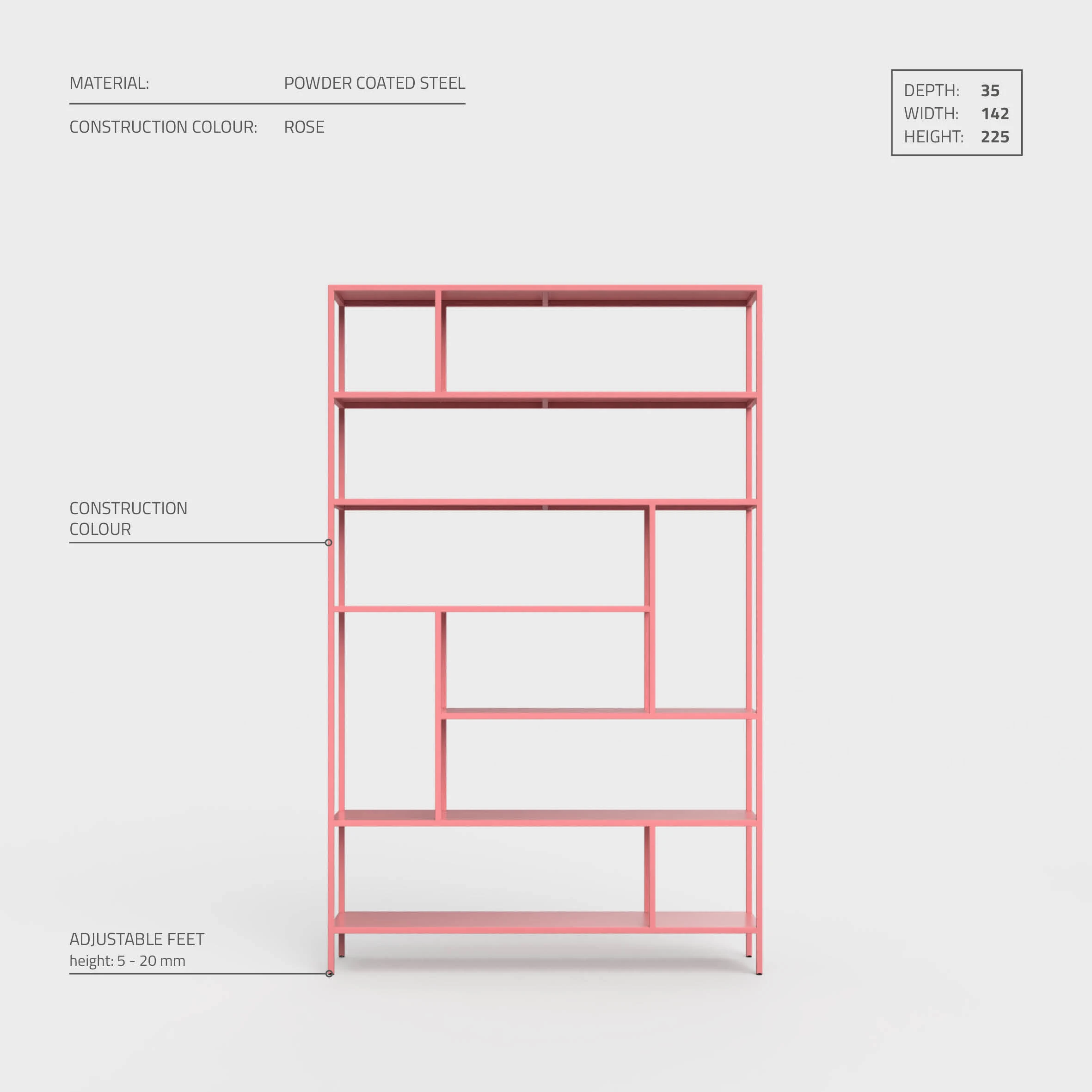 Den lette og åpne formen gjør AZALIA 01 velegnet både som romdeler og frittstående reol. Den kan gli naturlig inn i et moderne hjem og tilføre et uttrykk der funksjon og estetikk smelter sammen. Valget av farge gjør at møbelet enkelt kan tilpasses din personlige stil og atmosfære.