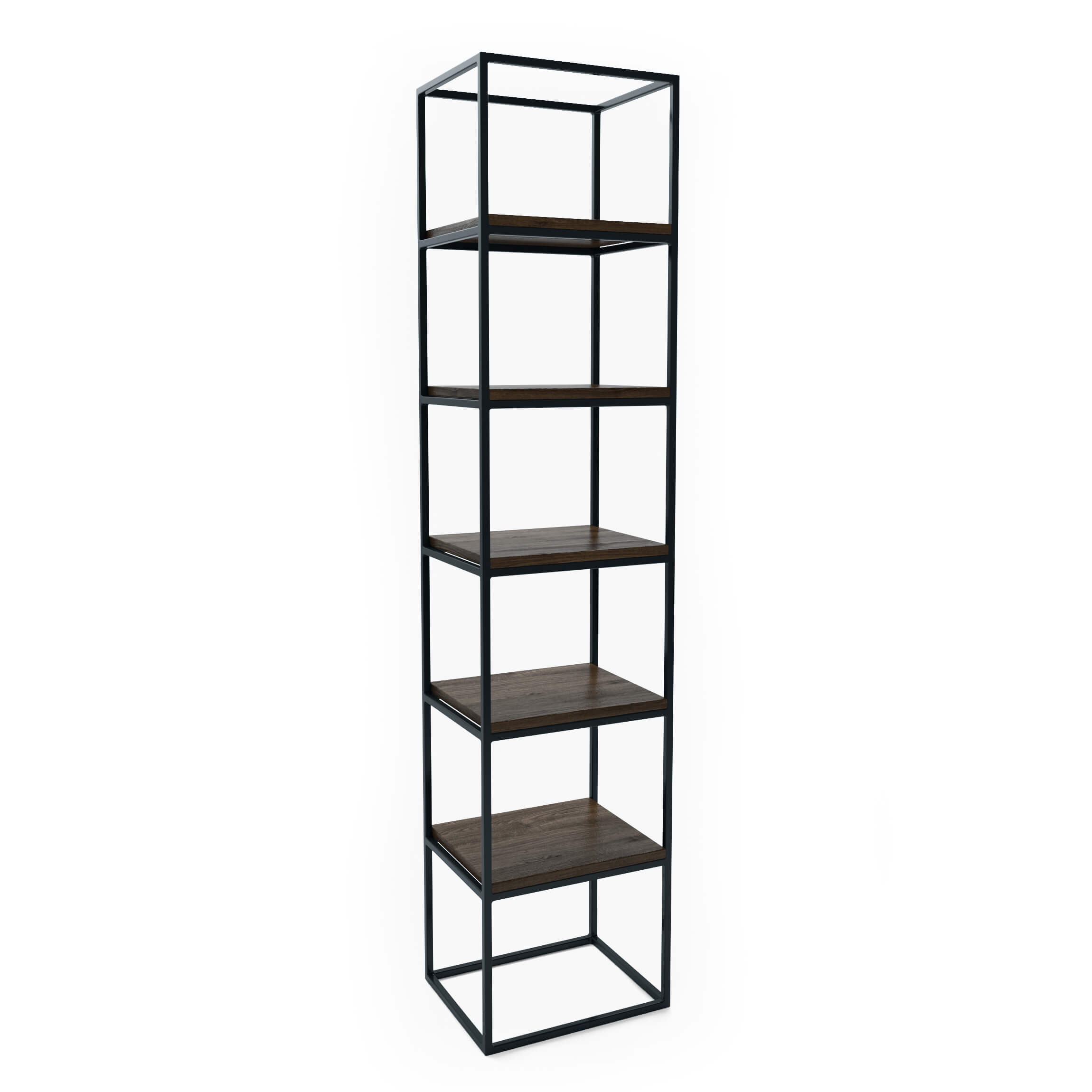 Smal høy reol med seks hyller.