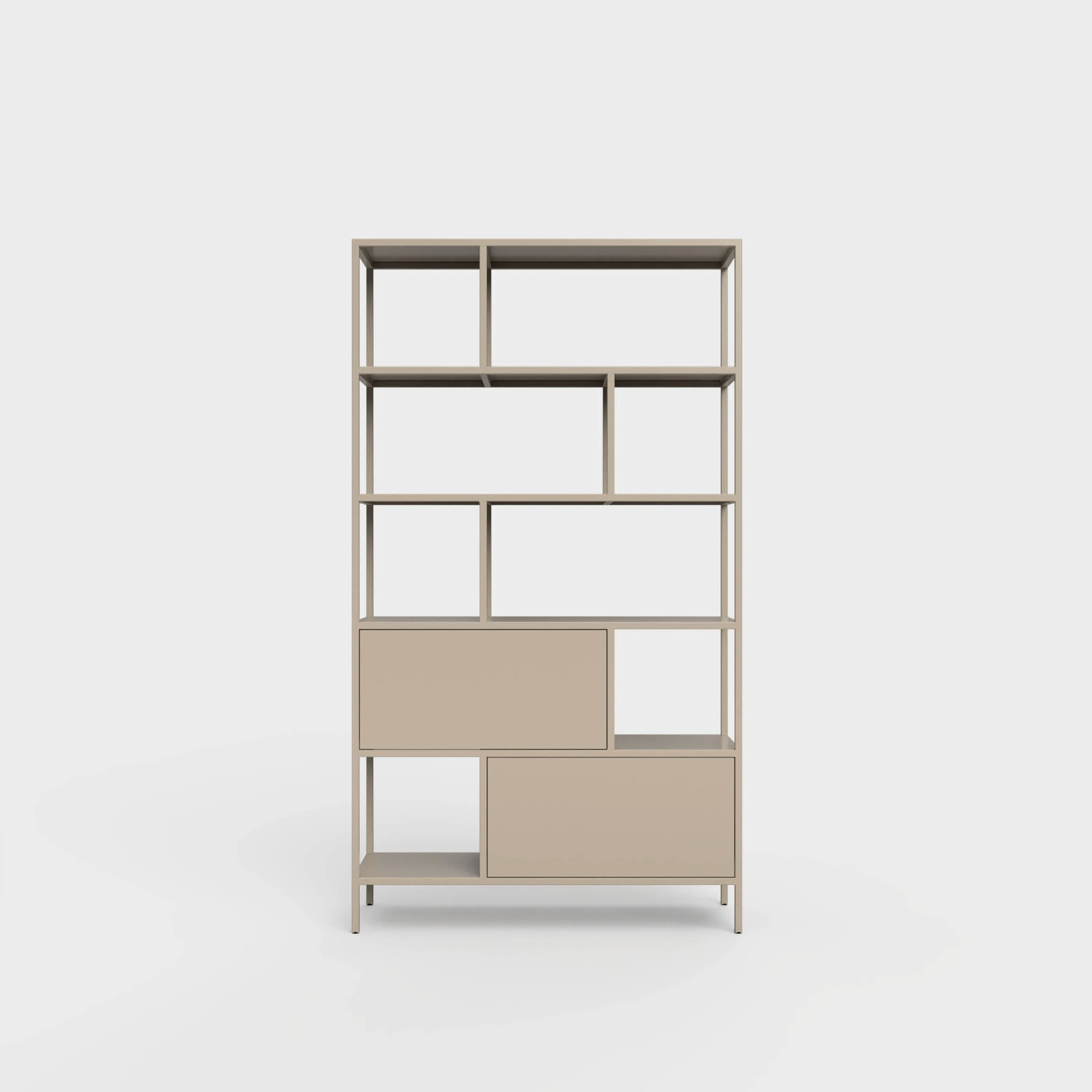 LILUM 02 er en visuell komposisjon som skaper orden uten å fjerne varme. Med asymmetriske hyller og lukkede rom gir den plass til både det du vil vise frem – og det du vil ha for deg selv.