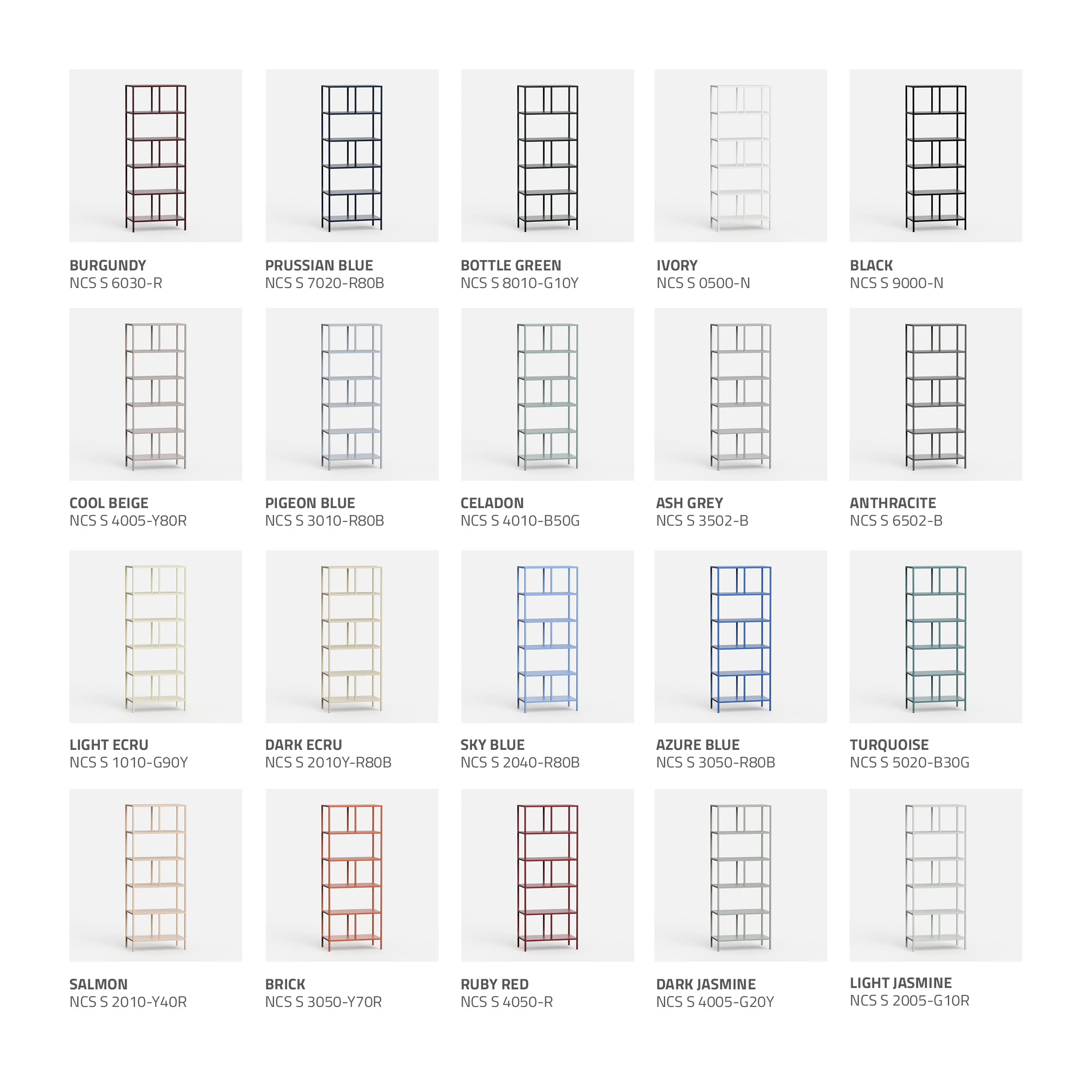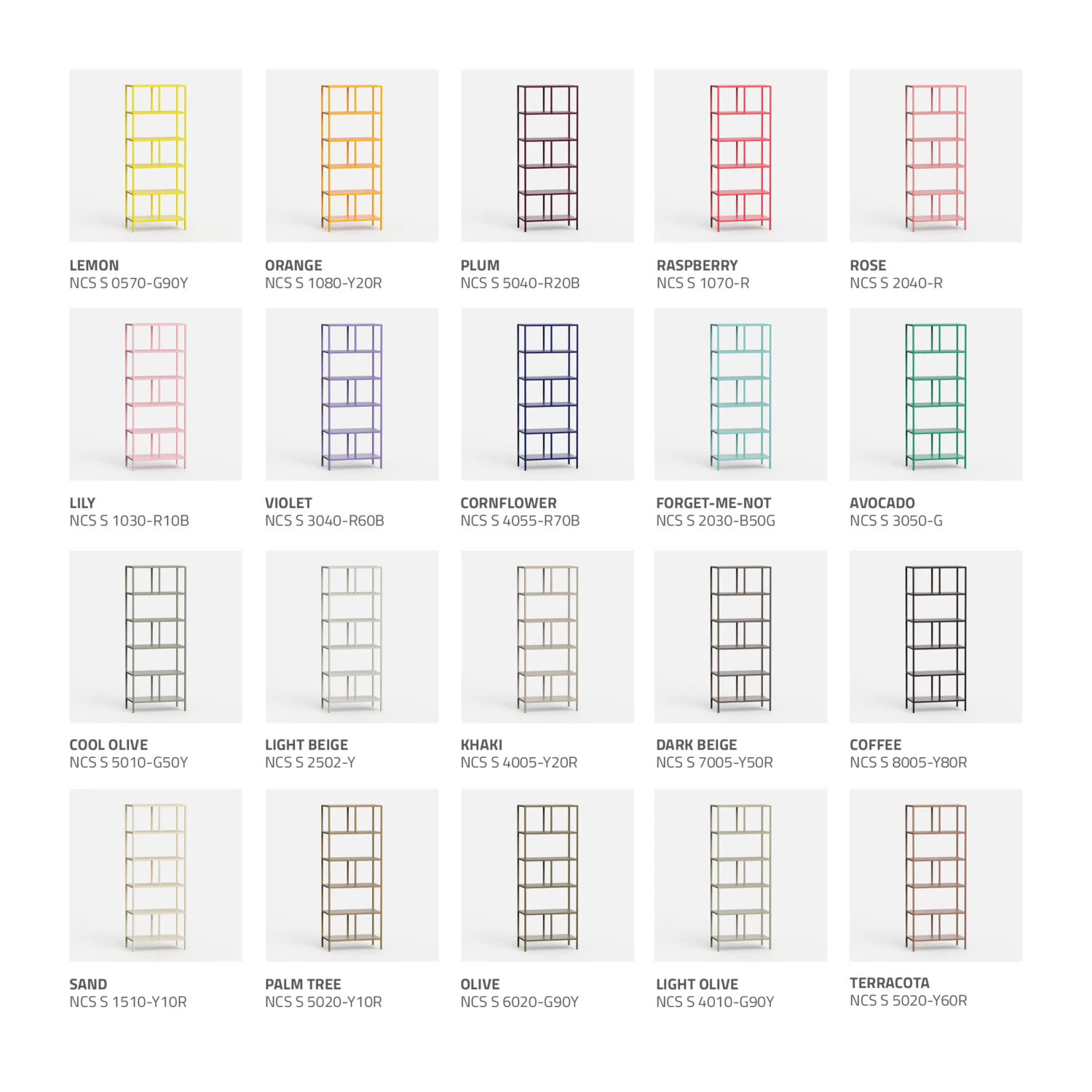 Hos DESIVA får du full frihet til å skape et møbel som passer din stil. Velg blant over 40 pulverlakkerte farger – slitesterk kvalitetslakk fra Hellas. Overflaten er matt, sterk og motstandsdyktig mot både fukt, sollys og fingermerker. Alle møbler er laget i heltrukket stål – ramme, fronter og topp – og herdes i ovn for et varig og behagelig uttrykk. Du kan også velge fargen på innsiden: 10 nyanser på de glatte, innvendige platene gjør at skapet føles riktig – hver gang du åpner det.