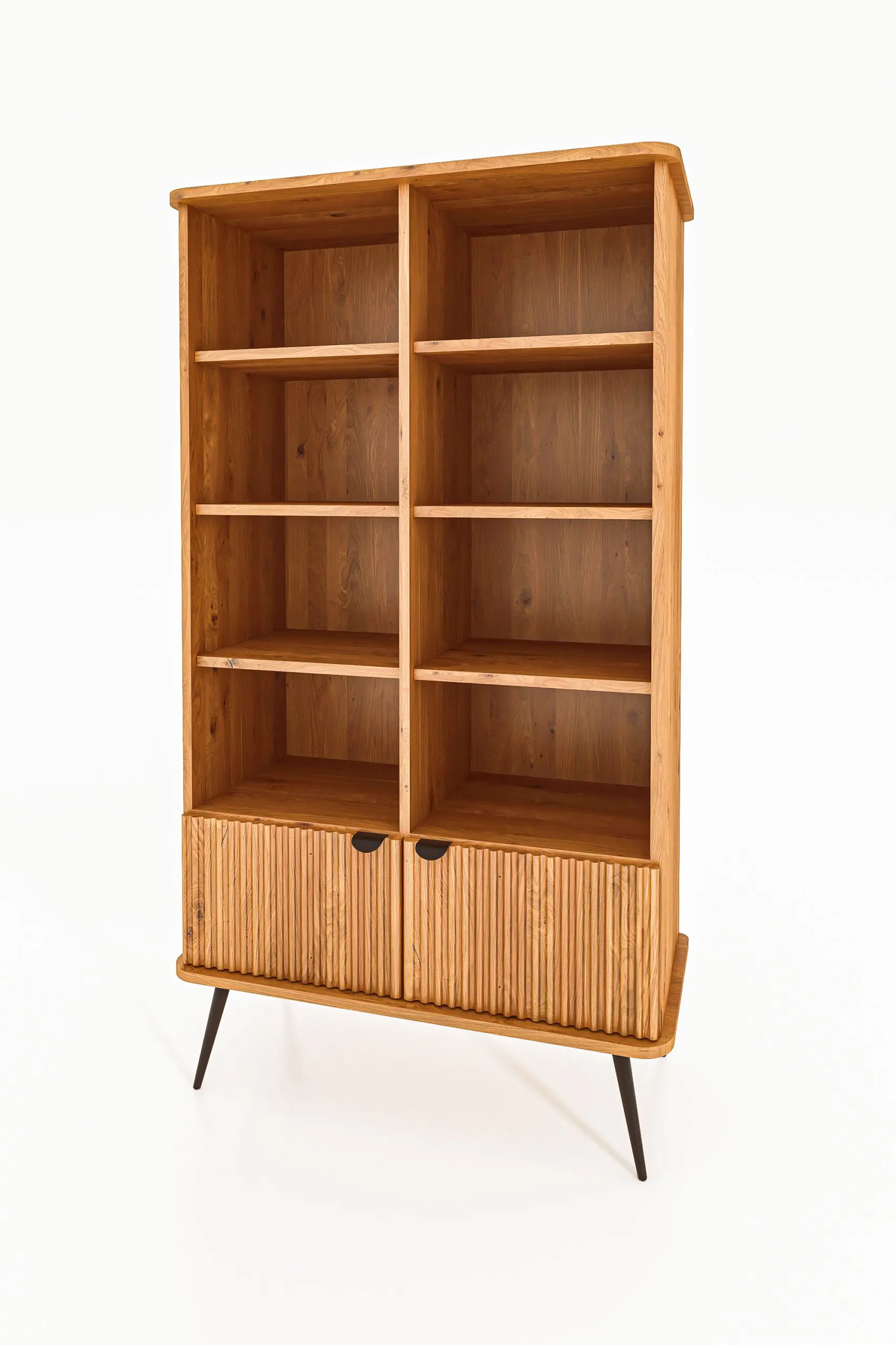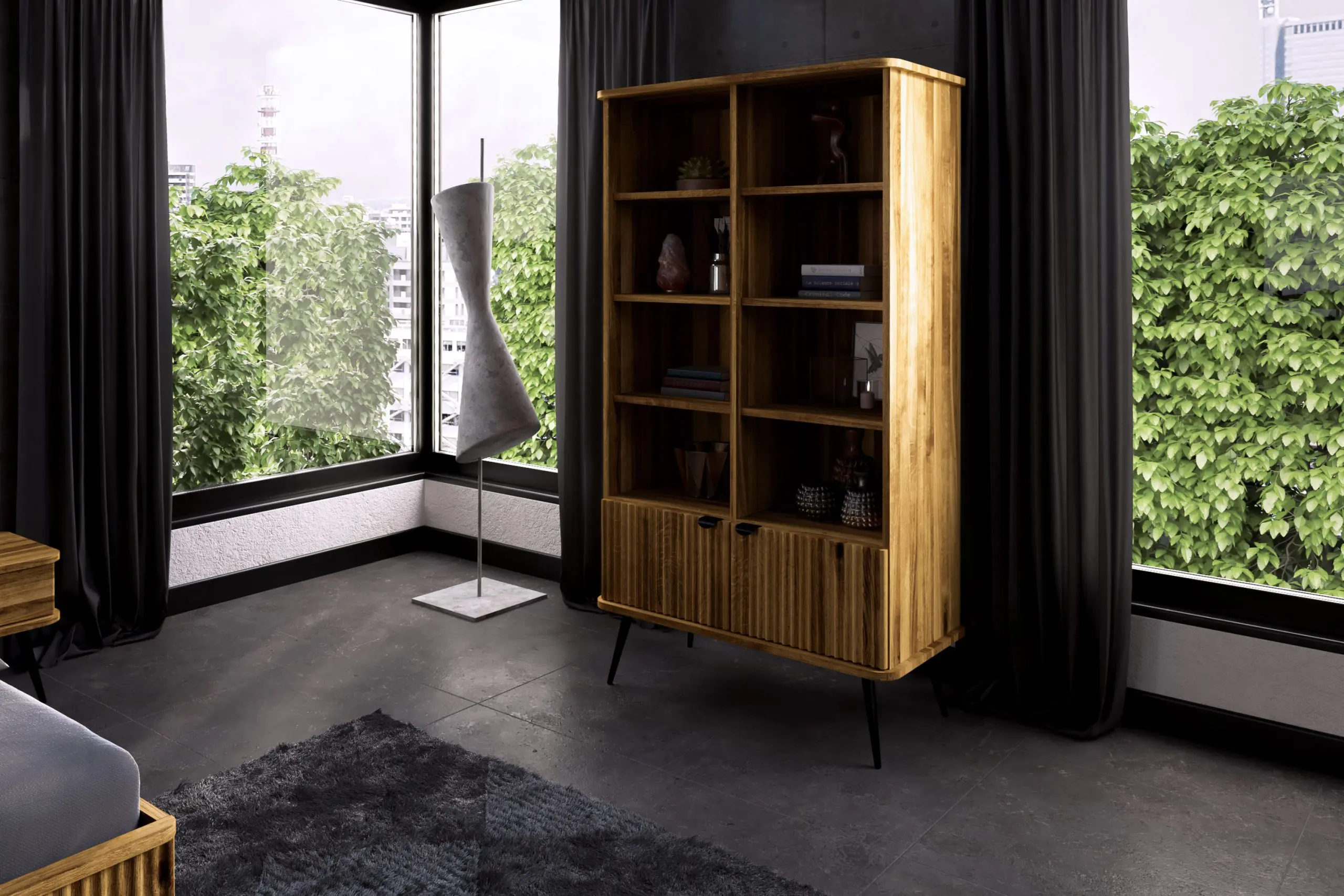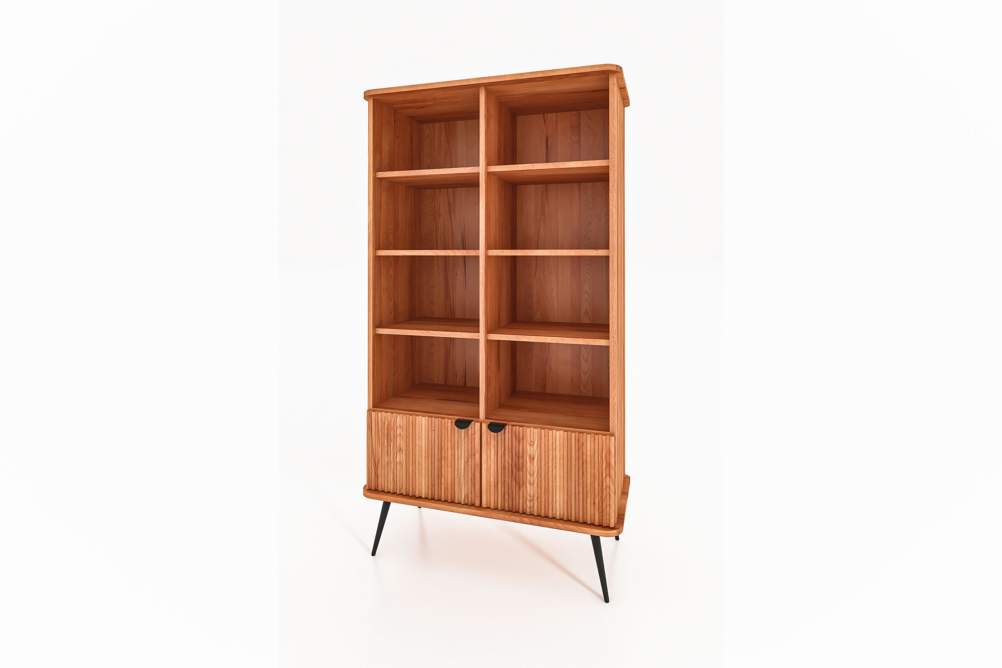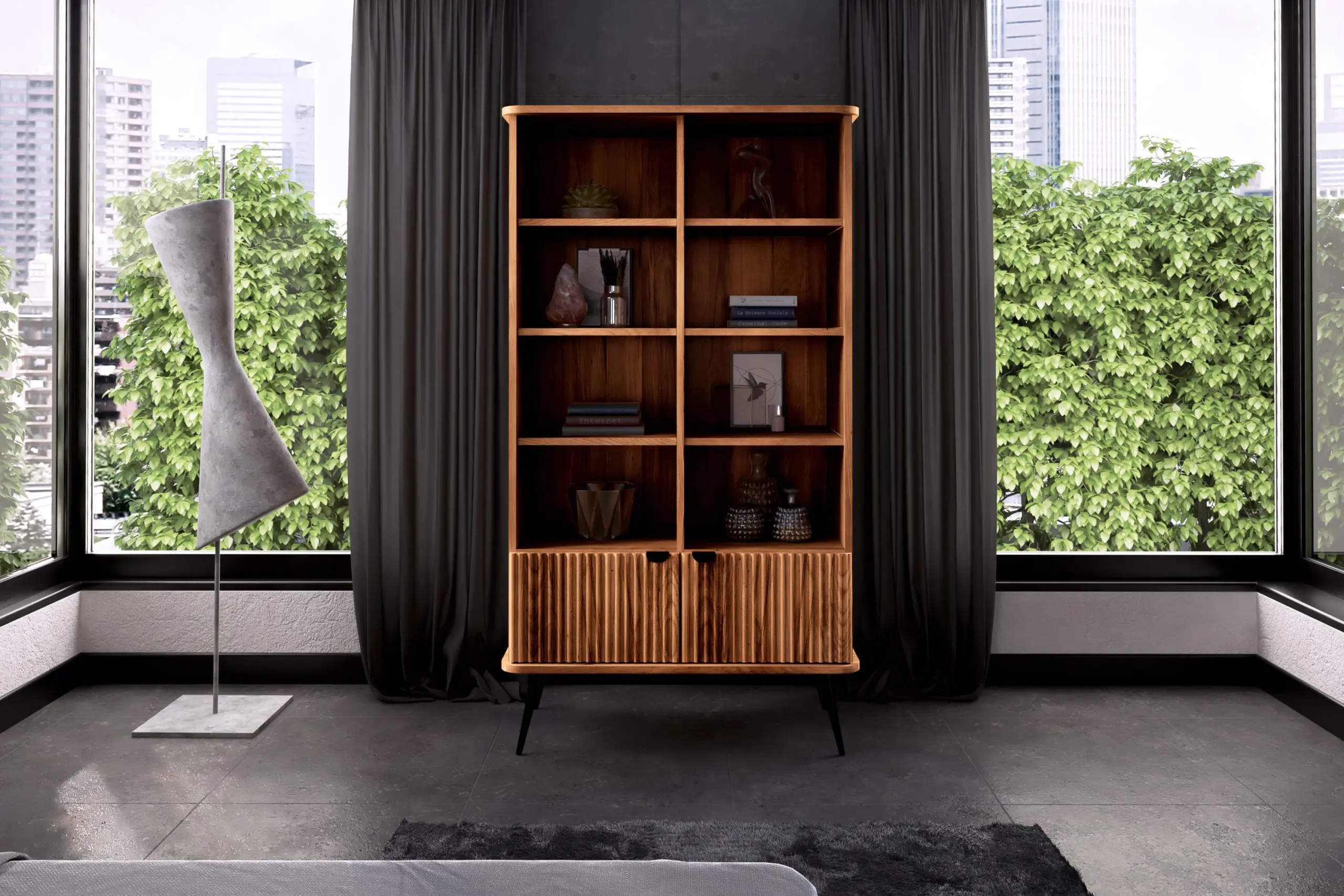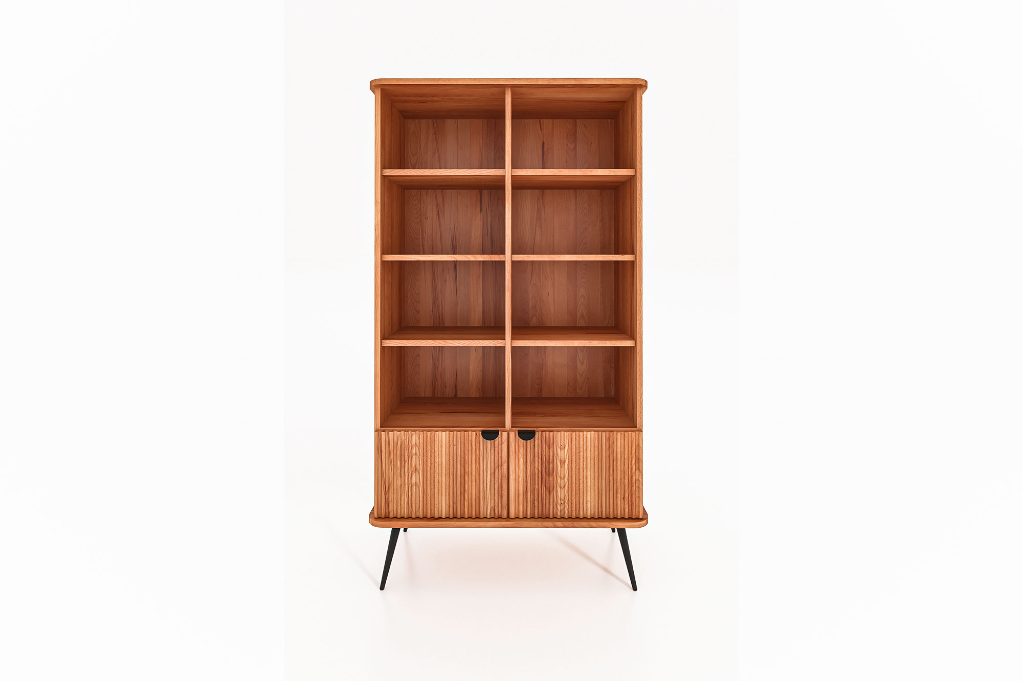 KULA-reolen kombinerer karakter og ro i ett møbel. Den åpne overdelen gir åtte romslige hyller til bøker, keramikk eller personlige detaljer, mens de to riflede dørene nederst skjuler det du ikke ønsker fremme – uten å bryte med den estetiske helheten.